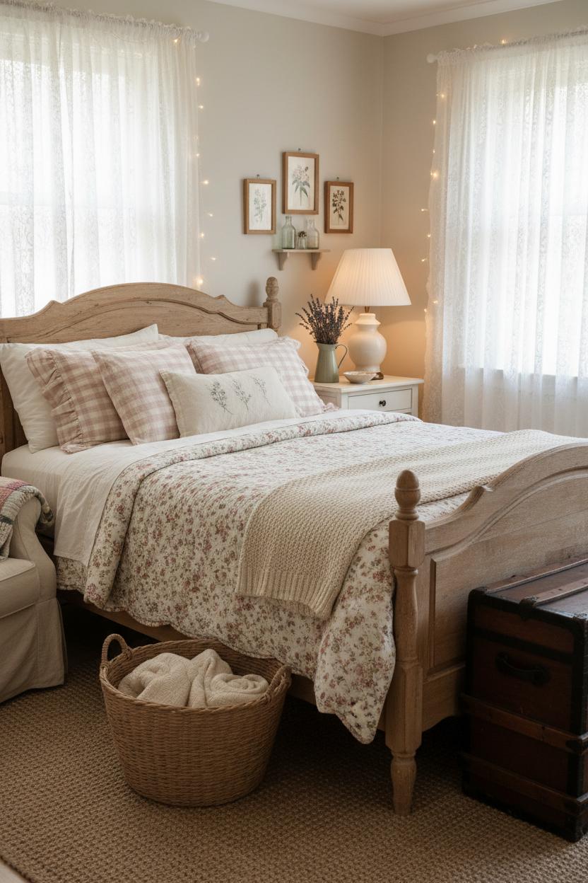 For glow, nothing beats the magic of fairy string lights draped over a headboard or tucked into a wire basket on the dresser. Mix them with beeswax candles and a small linen lampshade to create layered lighting that flatters every hour of the day. If you’re drawn to shabby chic decor, bring in soft-painted armoires and distressed footstools, then balance them with natural textures—wicker hampers, jute rugs, and linen pillow shams—to keep the look intentionally relaxed. Try a DIY milk-paint wash or a light sanding on thrifted finds to coax out that timeworn finish, and seal with a matte wax so pieces feel velvety to the touch. The result is a bedroom that feels tender and timeless—vintage farmhouse style with a whisper of romance, as cozy as a handwritten letter and as enduring as your favorite keepsake.