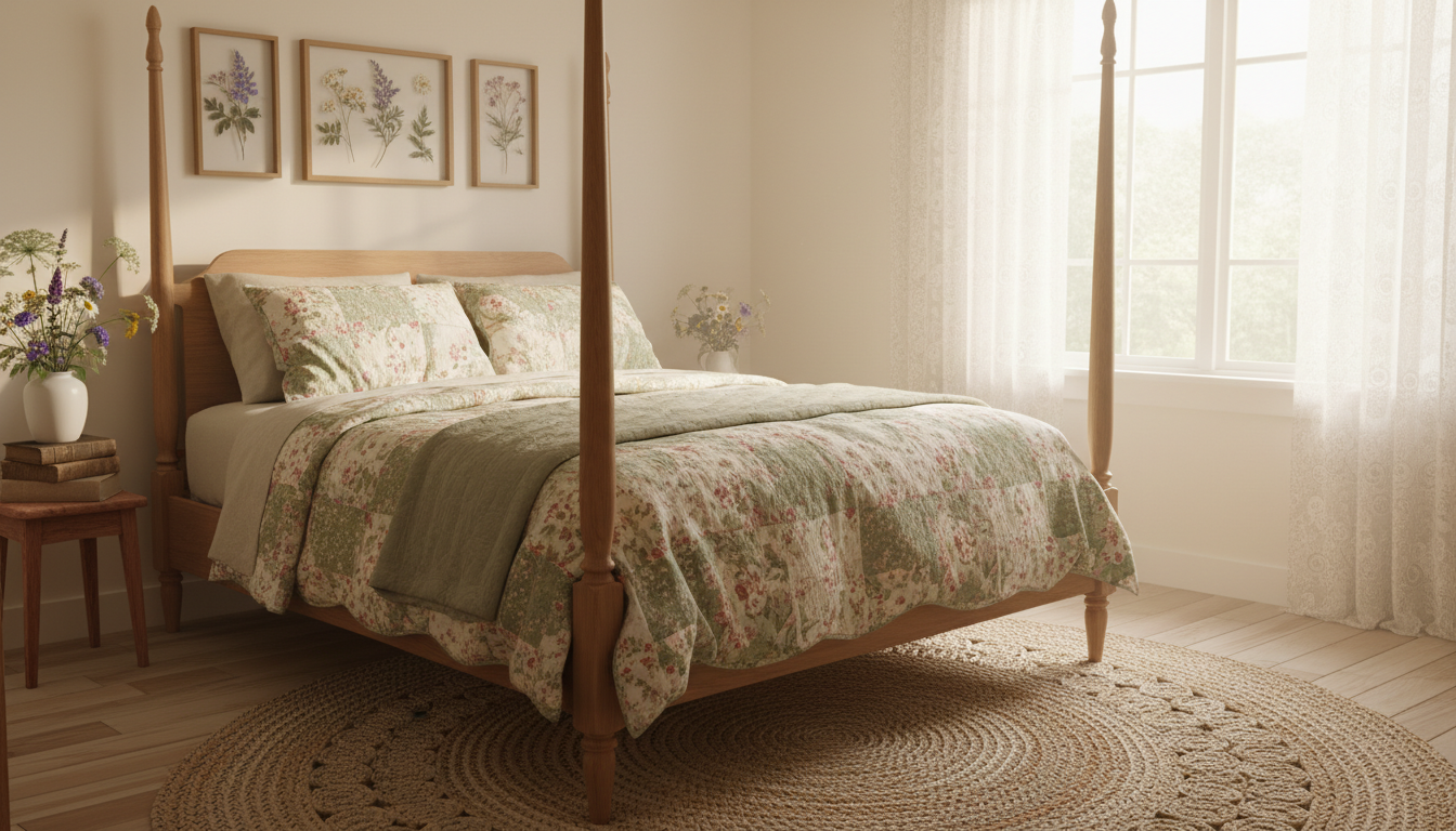 Start with the softest palette you can dream up—creamy whites, tea-stained beige, faded blush, and whispery sage—and let that guide every layer. One of my favorite cottagecore bedroom ideas is to anchor the space with a sturdy wooden bed frame, something with gentle curves or timeworn edges, then pile on tactile comfort. Think a floral quilt queen draped just so, a stack of ruffled shams, and a knit throw at the foot for those chilly mornings. Mix petite ditsy florals with gingham and stripes in the same muted tones so it feels collected rather than busy, and let the imperfections show; they’re what make cozy bedroom decor feel lived-in and loved.