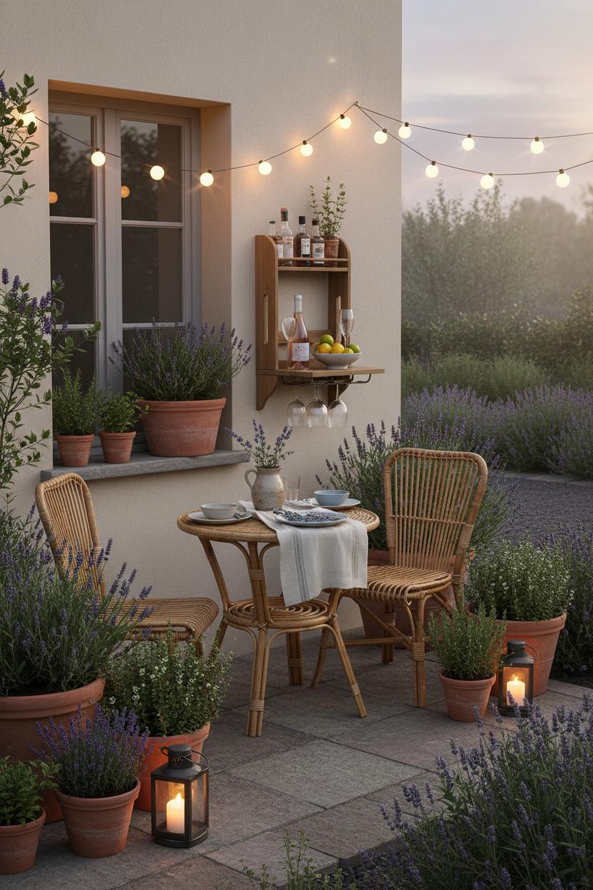 Even the tiniest terrace can play host to a dreamy dinner when you lean into scale and scent. Start with a petite café table and two chairs—rattan patio furniture feels airy and coastal, and its woven texture pops against the silvery greens of a lavender patio. Tuck the setup along a path or beneath a window, then frame it with terracotta planters overflowing with lavender plants, thyme, and trailing oregano to cue that effortless Mediterranean garden vibe. Overhead, drape outdoor string lights in a soft swag for that magical bistro lights patio glow; it instantly makes the space feel intimate and special, even if your footprint is just a few pavers wide. Layer in a linen runner, mismatched ceramic plates, and a small pitcher of snipped stems from your own pots. The trick is to keep the palette sun-washed and simple so the purples and greens sing while conversation lingers.