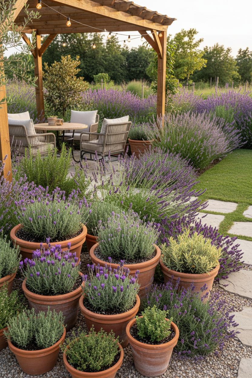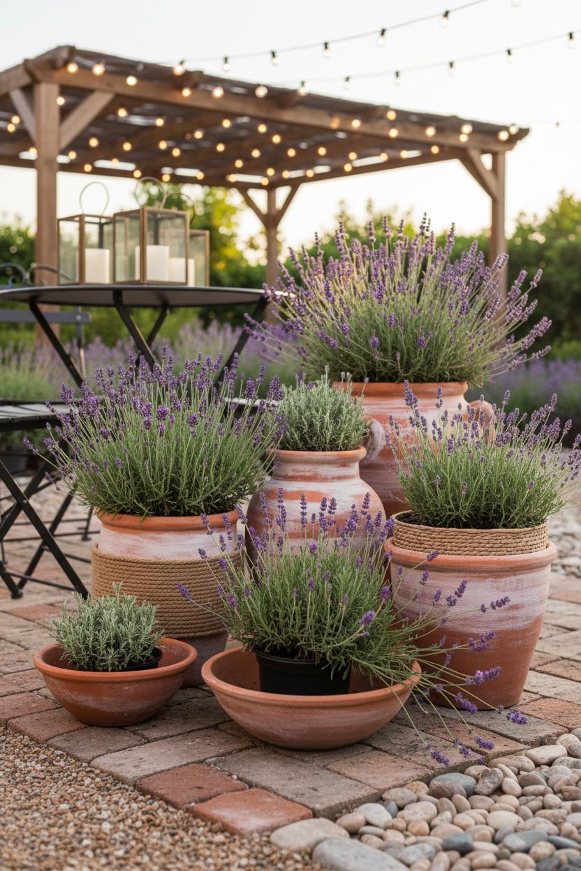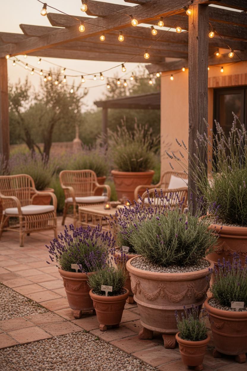 Think sun-warmed clay, soft pebbles underfoot, and a palette of russet, ochre, and sand that makes every purple bloom glow. Terracotta planters are your secret to that effortless, lived-in charm—group them in threes and fives, mixing tall urns with low bowls, so your lavender plants spill and sway at different heights. Tuck in pockets of white river pebbles or honey-toned gravel between containers to create an instant courtyard vibe, and top-dress the soil with a thin layer of pebbles to bounce light, retain moisture, and keep the base looking tidy. For a true Mediterranean garden feel, blend silvery herbs like rosemary and thyme with the lavender, then add a single olive or dwarf citrus in an oversized pot as a sculptural anchor. The warm earth tones do the heavy lifting: terracotta, sand, sunbleached wood, and woven textures play beautifully with purple, creating a grounded, tranquil lavender patio that looks curated but never fussy—perfect inspiration if you’re hunting for outdoor patio ideas that feel elevated yet easy.