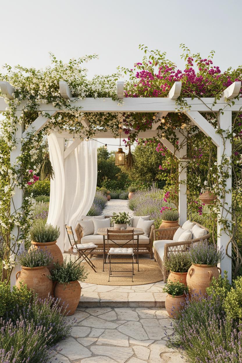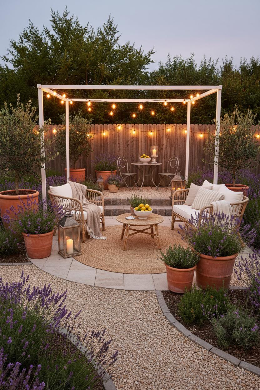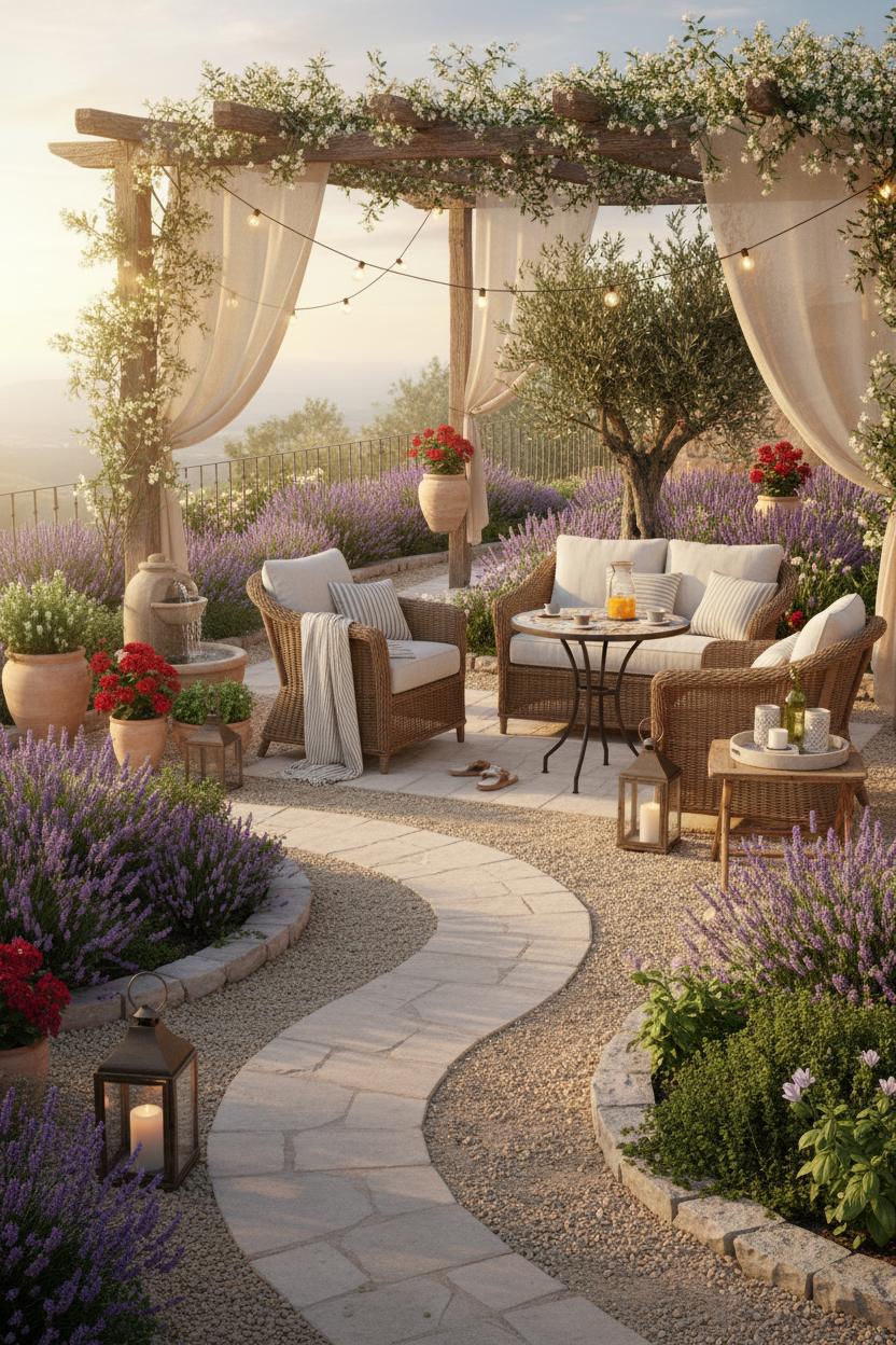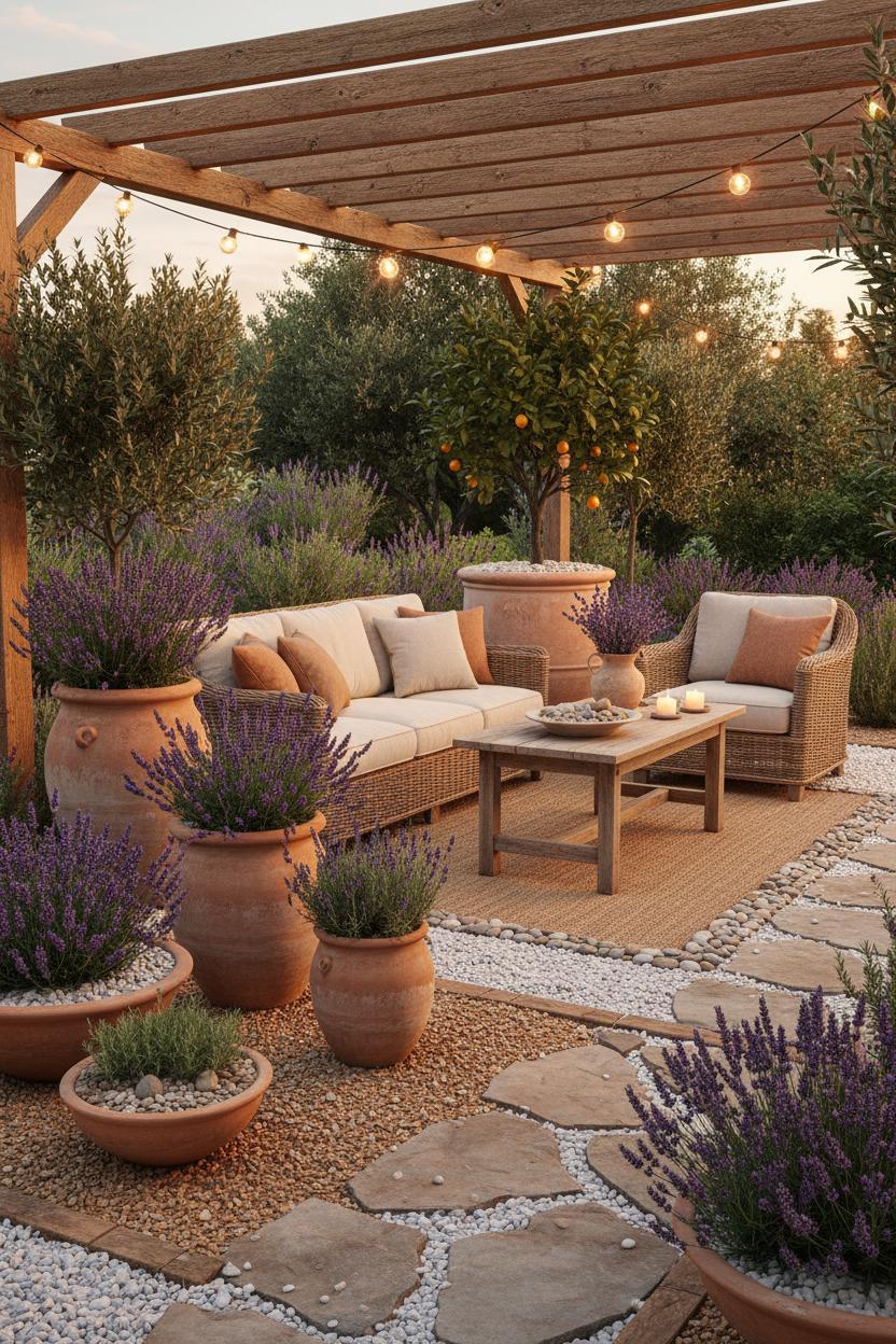 If you’re chasing that sun-washed, vacation-in-the-Med feeling, start by turning your space into a lavender patio that borders every path and seating zone with soft, silvery foliage and waves of purple. Think simple, earthy materials: pale pavers with a ribbon of pea gravel, a few hand-painted tiles as accents, and a scattering of terracotta planters stuffed with lavender plants, rosemary, and trailing thyme. This is one of those outdoor patio ideas that feels chic but effortless—keep the palette sunbaked and breezy with chalky whites, clay tones, and a hint of ocean blue, then let the scent of herbs and the hum of bees do the rest. For backyard landscaping that looks lifted from a cliffside village, carve out curvy beds rather than straight lines, add a low stone border, and tuck in an olive or dwarf citrus as a focal point. A petite bubbling fountain or ceramic jar water feature brings that soothing courtyard soundtrack and invites instant exhale.