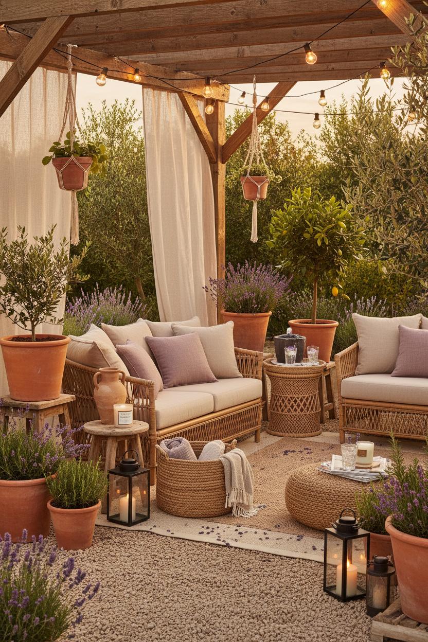 Above it all, create a canopy moment—whether under an outdoor pergola or a simple timber beam—then zigzag outdoor string lights to set that instant bistro lights patio glow. Sheer outdoor curtains can soften the edges and offer shade, while a petite tabletop fountain hums quietly beside a tray of iced lavender lemonade. For easy, high-impact outdoor patio ideas, repeat materials so the space feels collected: woven seagrass under planters, macramé hangers in the corner, a clay urn as a side table, and a jute pouf for feet-up lounging. Keep colors sun-washed and natural so the blooms steal the spotlight, and choose resin-wrapped rattan for durability without sacrificing that breezy texture. A sprinkle of petals on the rug, a stack of well-thumbed garden mags, and a candle with herbaceous notes complete the mood. When twilight arrives and the bulbs blink on, this layered little haven glows like a postcard—proof that with a few thoughtful textures and some well-placed lavender, even the smallest patio corner can feel like a passport to a Mediterranean garden daydream.