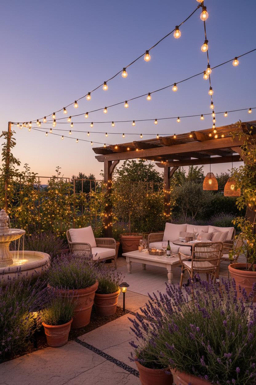 Finally, layer in light. String solar outdoor string lights from fence to tree to outdoor pergola in a loose zigzag, or cement a couple of metal poles into tall planters and drape them overhead for a magical bistro lights patio glow. Choose warm white bulbs for that café-at-dusk feel, and look for outdoor string lights with dusk-to-dawn sensors so they click on as the sky fades. A few lanterns on tabletops echo the sparkle and help define zones—cocktails here, reading nook there. With the lights twinkling above, terracotta planters perfuming the air, and a simple path underfoot, your lavender patio transforms into an inviting, budget-friendly escape you’ll never want to leave.