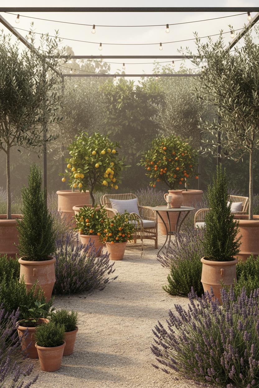 Picture the soft, silvery shimmer of olive leaves playing against inky rosemary and the sunlit pop of lemon and mandarin—this is the color and scent symphony that makes a lavender patio feel like a tucked-away corner of the Mediterranean. Ground your palette with weathered terracotta planters and gravel underfoot, then layer in billowy lavender plants as edging to soften paths and borders; their dusky purple hums quietly while olive trees in pots lend sculptural height and a muted sage backdrop. Tuck compact citrus—Meyer lemon or calamondin—near the seating zone so those glossy leaves and cheerful fruit become natural focal points, especially beside light-catching rattan patio furniture that warms the whole scene with honeyed texture. The look is effortless and transportive, a classic Mediterranean garden vibe, where silvers, greens, and soft purples are punctuated by bursts of sunny yellow and tangerine. If you’re collecting outdoor patio ideas, let this trio—olive, rosemary, and citrus—guide your paint chips and plant list; it’s a simple formula that reads luxe without trying.