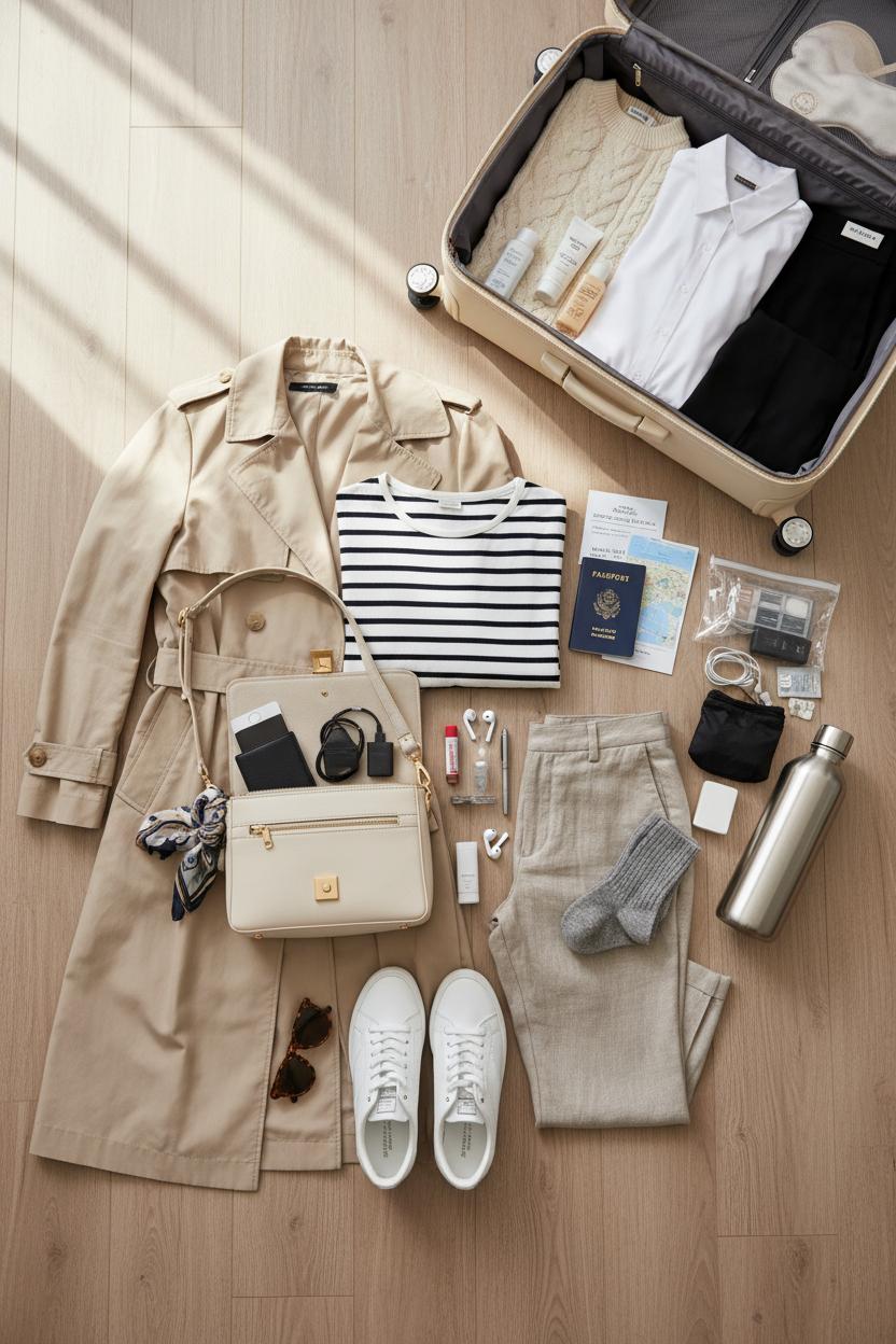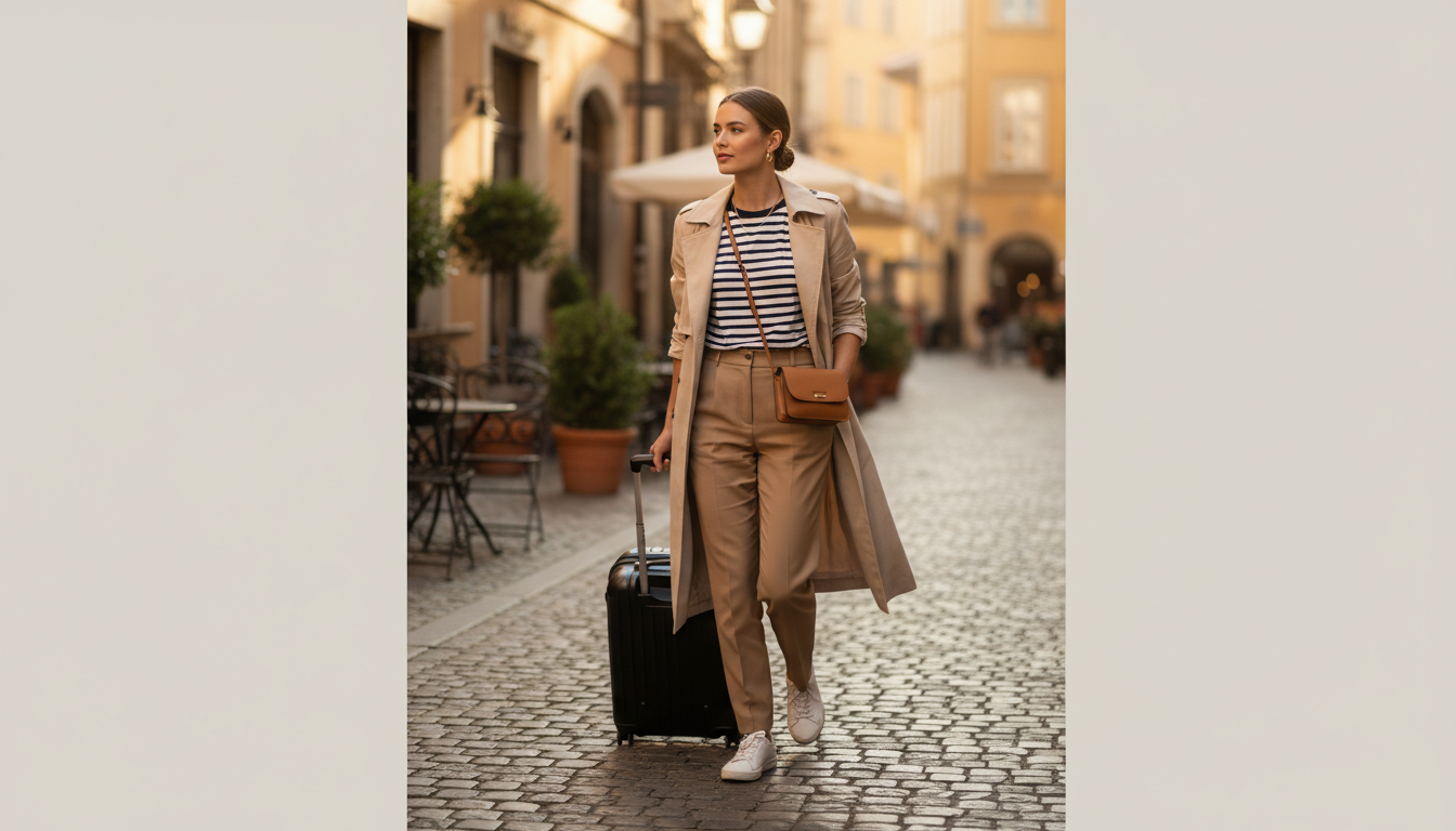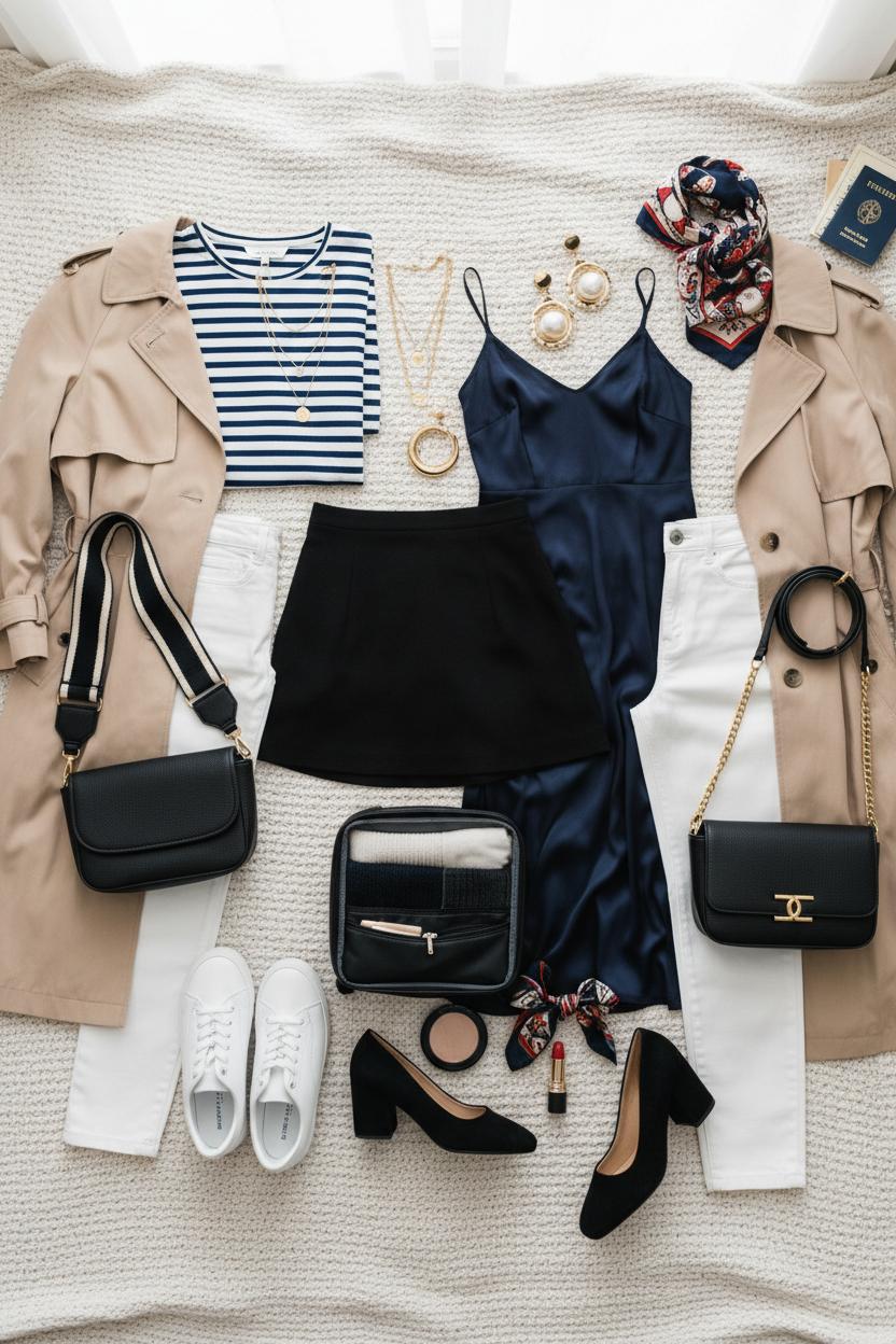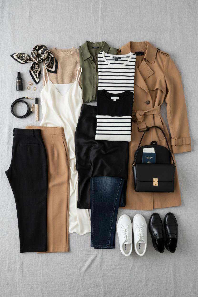 If you’ve ever stood over an open carry on suitcase wondering how on earth ten days of abroad outfits will fit, here’s your gentle nudge: start with a tight color palette and a simple formula. Think black, ivory, camel, and one accent (olive or oxblood) so everything mixes without effort. Your travel capsule wardrobe can be as streamlined as this: two trousers (one tailored, one relaxed), one dark jean, one midi skirt, one slip dress, five tops (a silky button-down, a lightweight knit, a tank, a soft tee, and a striped tee women love for that timeless French vibe), one featherweight sweater, and one hero layer—a classic trench coat women swear by because it sharpens every look and handles drizzle. Add two pairs of shoes (white sneakers women rely on for city miles plus loafers or ankle boots), a scarf, tights, and a compact umbrella. Finish with a crossbody travel bag that locks and sits close, because hands-free equals stress-free.