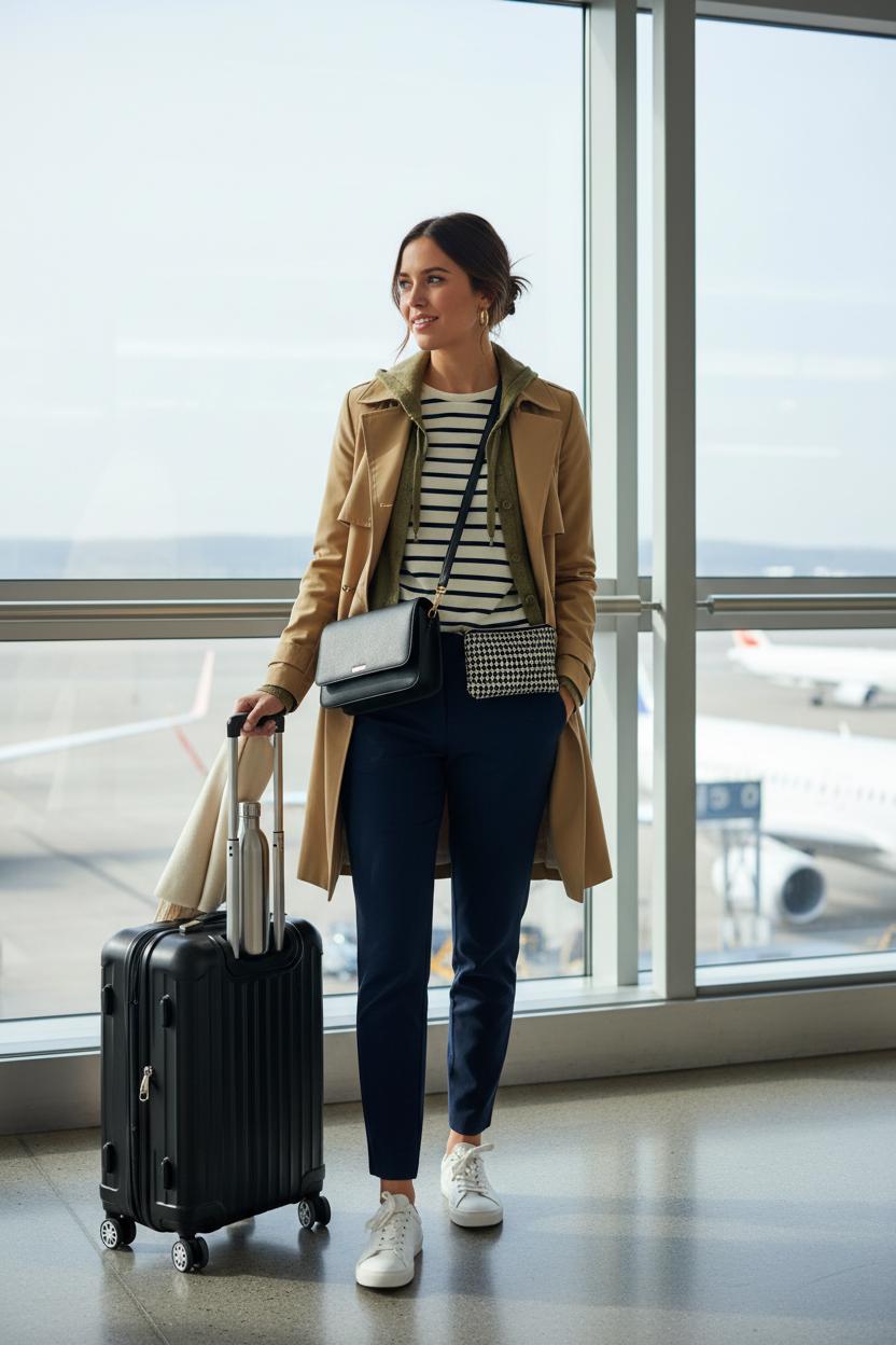 Before you wheel out the door, run through this quick, chic checklist for a foolproof airport outfit and everything you need within reach. Start with an easy base like a striped tee women love for its timelessness, plus relaxed trousers or soft knit pants. Slip on white sneakers women swear by for comfort, and top it all with a light trench coat women can drape over shoulders or roll into a pillow. This combo nails that effortless vacation style and layers beautifully from chilly cabins to sunny arrivals. Keep jewelry minimal, pocket a pair of cozy socks, and add a silky scarf that doubles as a wrap. The finishing touch is a crossbody travel bag so your hands stay free for coffee and your carry on suitcase.