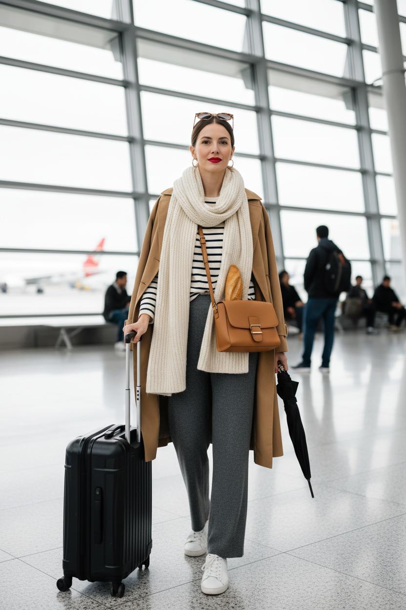 Your airport outfit sets the tone for the trip: soft knit pants, that striped tee, and the trench over your shoulders, with a scarf that doubles as a blanket and those clean white sneakers. Pack light in a carry on suitcase and let smart accessories do the styling—sunglasses, a compact umbrella, delicate gold hoops, and a red lip for instant polish. When you’re planning abroad outfits for cathedral visits or sacred sites, bring a lightweight layer to cover shoulders and hemlines that hit the knee; you’ll still feel chic without sacrificing respect or comfort. In cooler months, swap the knit for a fine turtleneck and add wool socks; in summer, linen trousers and a breezy shirtdress keep your vacation style fresh and photo-ready.