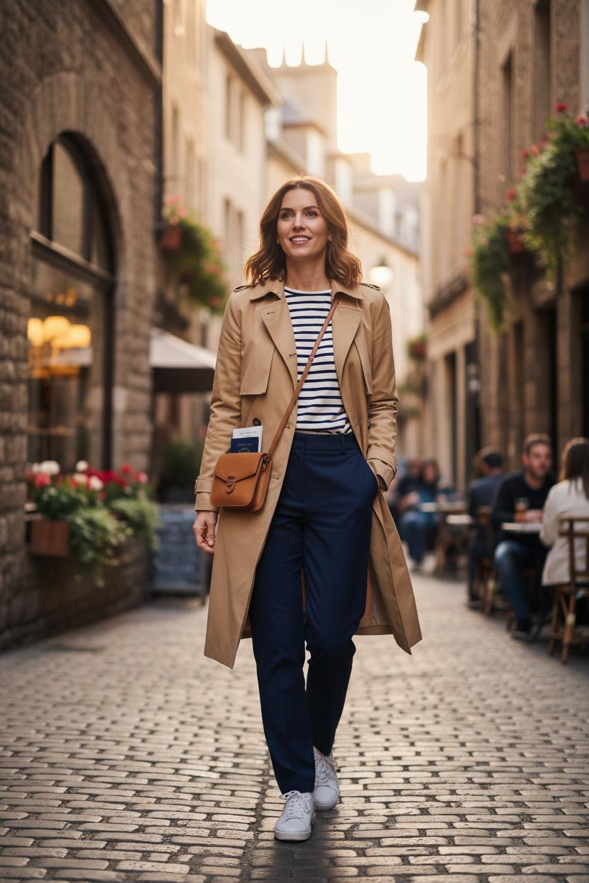 For an airport outfit that actually works beyond the terminal, think effortless layers: a striped tee women love for that Parisian nod, tailored trousers or relaxed denim, white sneakers women swear by for long walks, and a crossbody travel bag tucked neatly under your trench for hands-free ease. Once you land, the same hero layer elevates your vacation style—cinch the belt over a knit midi for dinner, or wear it open with shorts and a button-up for beach towns. It’s the secret weapon of abroad outfits because it adapts to everything: misty London mornings, sunny Roman afternoons, and cool Amsterdam evenings. When planning Europe outfits, keep your palette streamlined so the trench can anchor bolder accessories or a patterned scarf you pick up along the way. The result is a suitcase-friendly uniform that feels intentional, not fussy—ready for galleries, markets, and those spontaneous golden-hour photos. A good trench doesn’t scream for attention; it quietly makes everything else look better, the ultimate proof that one thoughtful layer can take you everywhere.