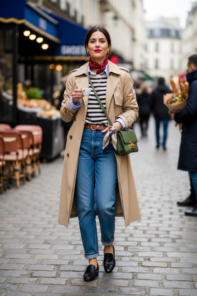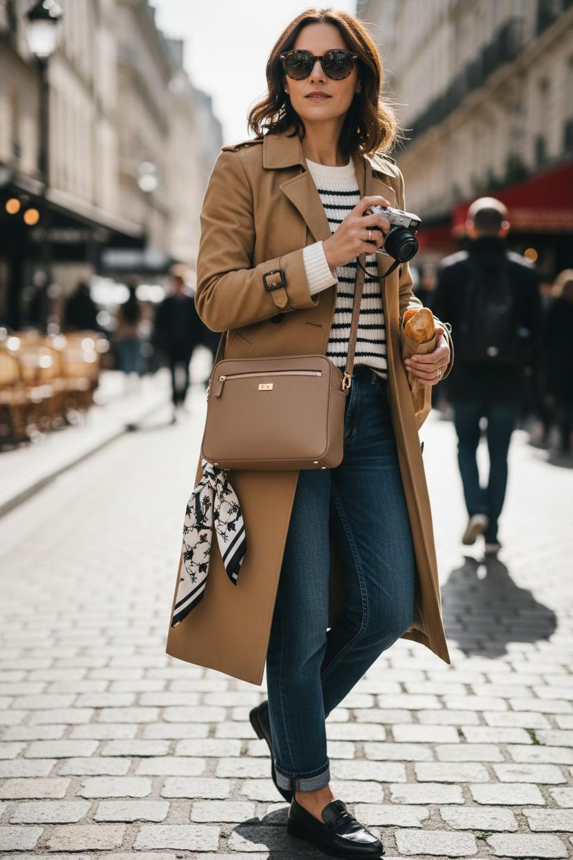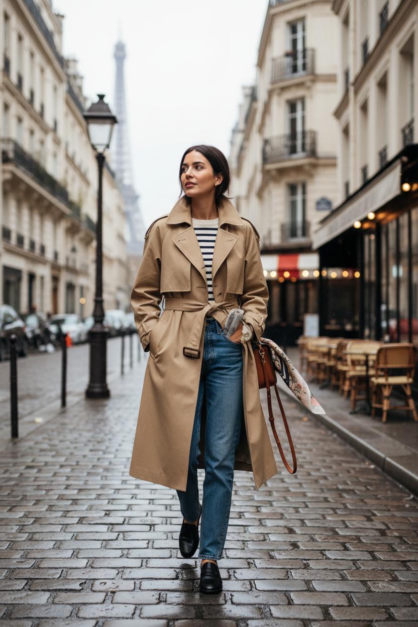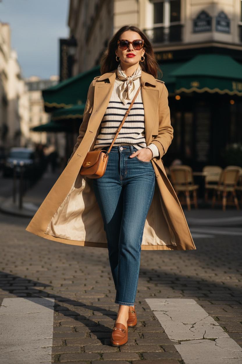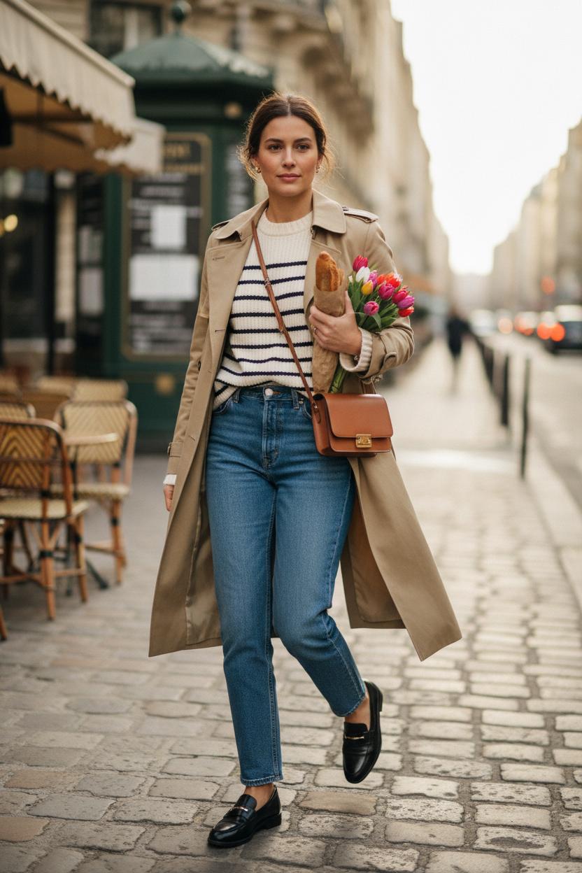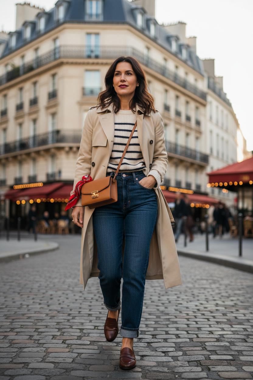 For a chic casual look that moves from museum to wine bar, play with subtle contrasts. Belt your trench for a neat waistline, then push up the sleeves to show a flash of ribbed knit from your stripes. Tuck the front of your denim just enough to frame a slim belt, roll the hems to spotlight those loafers, and add quiet gold hoops or a delicate chain for a hint of shine. A silk scarf knotted at the neck or looped onto your crossbody bag feels classic without being costume-y. If the forecast is moody—as Paris often is—swap in a lightweight cardigan under the trench or layer a crisp poplin shirt beneath the striped sweater for dimension that still feels breezy. This is the kind of intelligent layering that earns space in a travel capsule wardrobe and photographs beautifully from any angle.