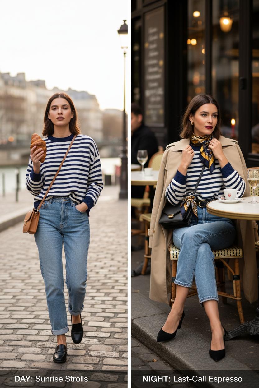 From sunrise strolls to last-call espresso, the secret to seamless day-to-night dressing is a strong base that already feels polished. Start with the quintessential Paris uniform: a striped sweater women love for its easy charm, straight leg jeans women reach for because they skim rather than squeeze, leather loafers women can actually walk in, and a compact crossbody bag to keep hands free for croissants and photos. This foundation nails that chic casual look the city is known for, and it’s the backbone of any smart travel capsule wardrobe. Midday tweaks are minimal—a half-tuck for shape, a cuffed hem to show ankle, a soft matte lip. You’re channeling European street style without trying too hard, and you’re collecting mental notes for your own Paris outfit ideas as you wander.