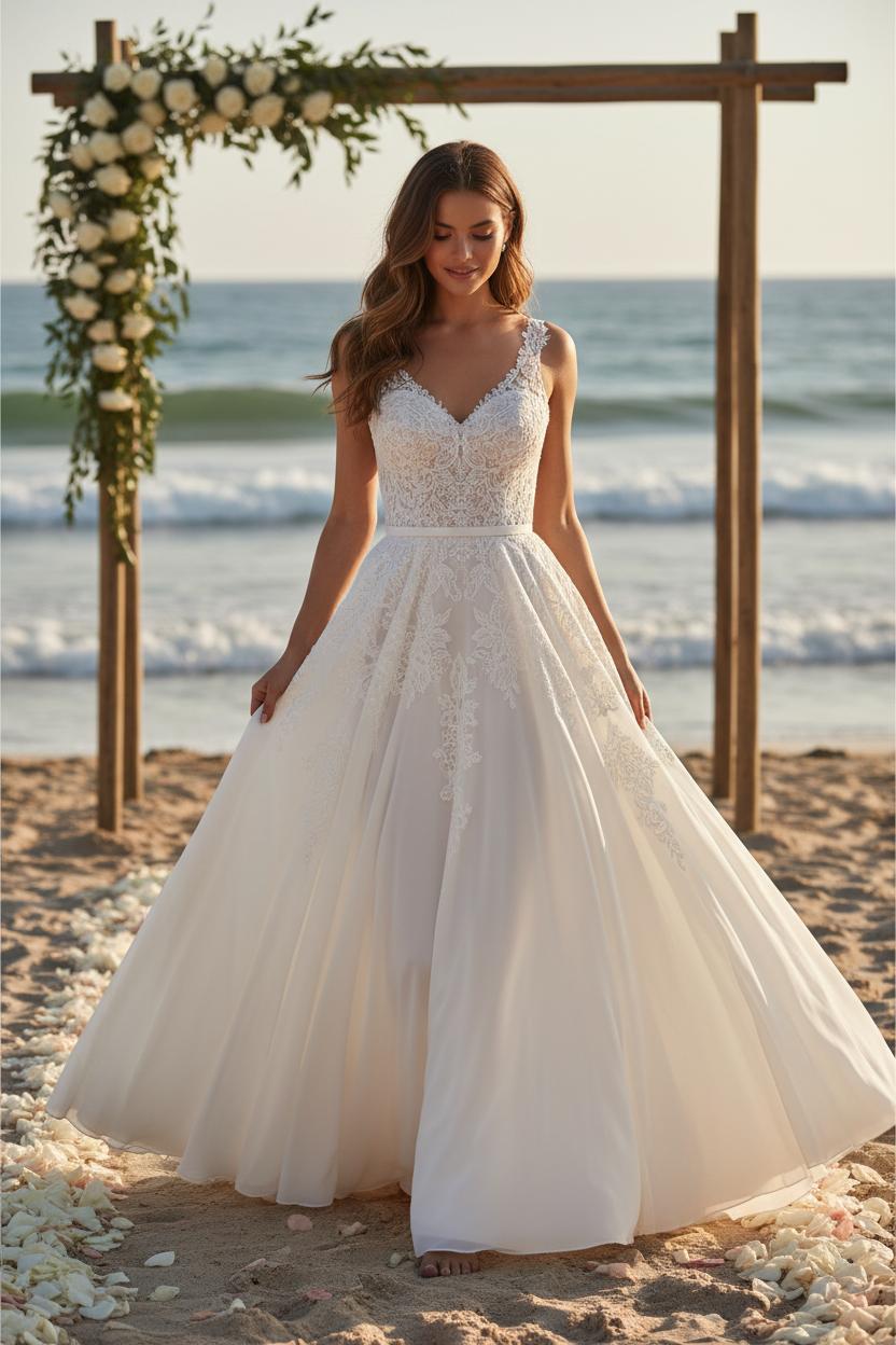 When you’re choosing the one, start by thinking about how you want to feel as you walk down the aisle—floaty and free, tailored and sculpted, or somewhere in between. An A-line bridal gown has that universally flattering magic, skimming the waist and drifting into a soft skirt that’s perfect for garden vows and beach breezes. If you’re dreaming of storybook drama, a ball gown brings volume and romance, especially in a lace wedding dress with cascading layers. Minimalists might love a sleek sheath that drapes like a whisper, while a mermaid wedding gown hugs every curve before flaring into a poetic sweep at the hem. If your heart leans toward effortless charm, a boho wedding dress pairs delicate patterns with airy movement, and for nostalgic souls, a vintage lace dress—think scalloped hems, covered buttons, and heirloom textures—feels beautifully timeless.