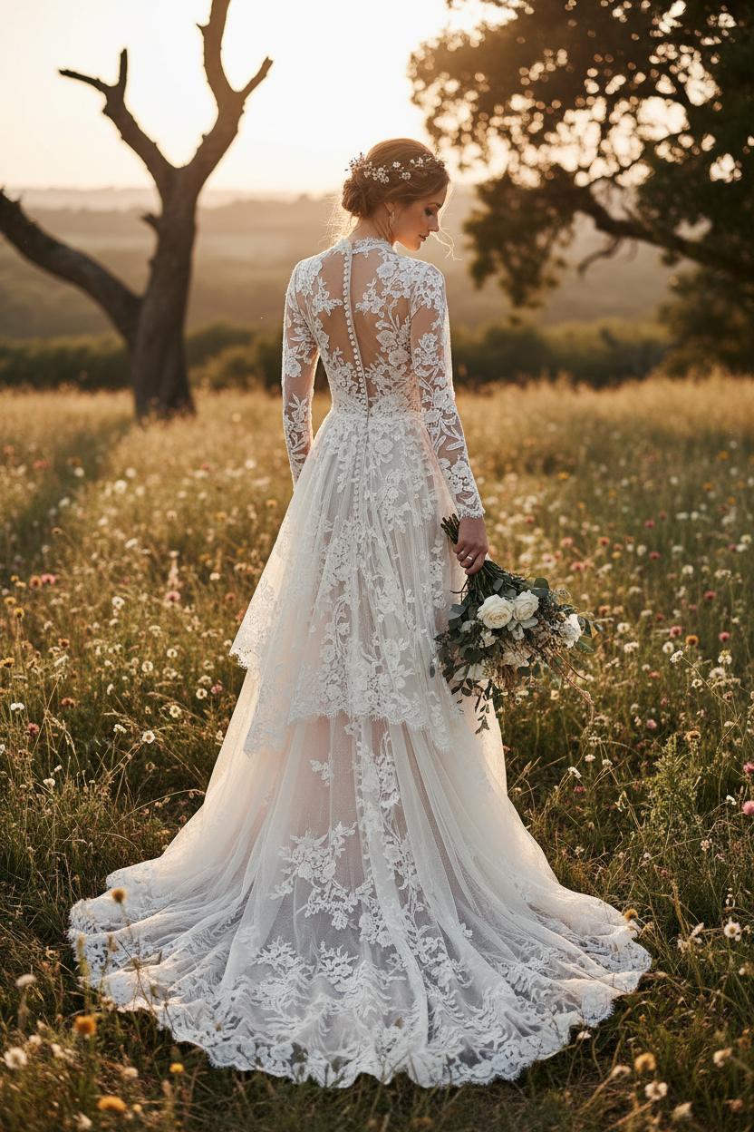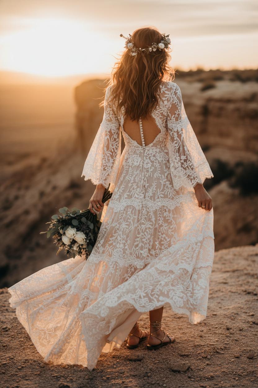 When it comes to shape, choose a bridal gown that matches your mood and setting. For garden vows, an easy A-line with flutter sleeves or a breezy slit feels charming and relaxed. If you’re planning a woodland or fall celebration, a long sleeve wedding dress with sheer bishop sleeves and lace cuffs strikes a cozy-meets-romantic note. Craving a little curve-hugging magic? A mermaid wedding gown rendered in airy lace balances free-spirited vibes with a sultry silhouette; a mermaid lace gown with a soft, chapel-length train is stunning on the sand at sunset or framed by desert blooms. Finish the look with tousled waves, a wildflower crown, or a stack of delicate gold bands, and maybe swap stilettos for lace-up sandals or ankle boots. Whether you’re drawn to a minimalist slip layered under a lace topper or a full-on boho lace bridal dress with fringe and flutter, the beauty of these designs is how they move with you—light, romantic, and a little unruly in the best way—capturing that floaty, heart-skipping feeling of saying yes under open skies.