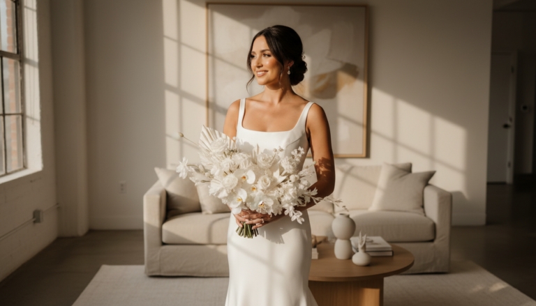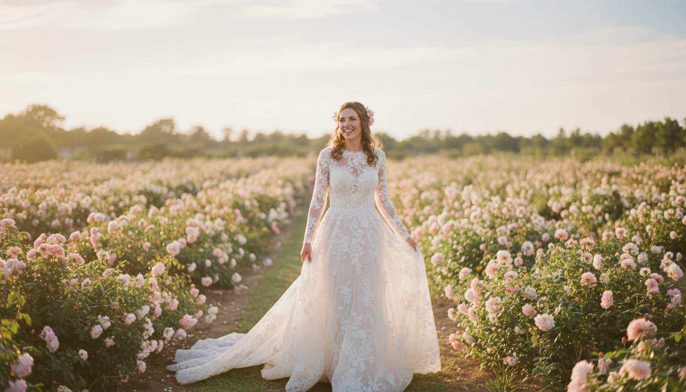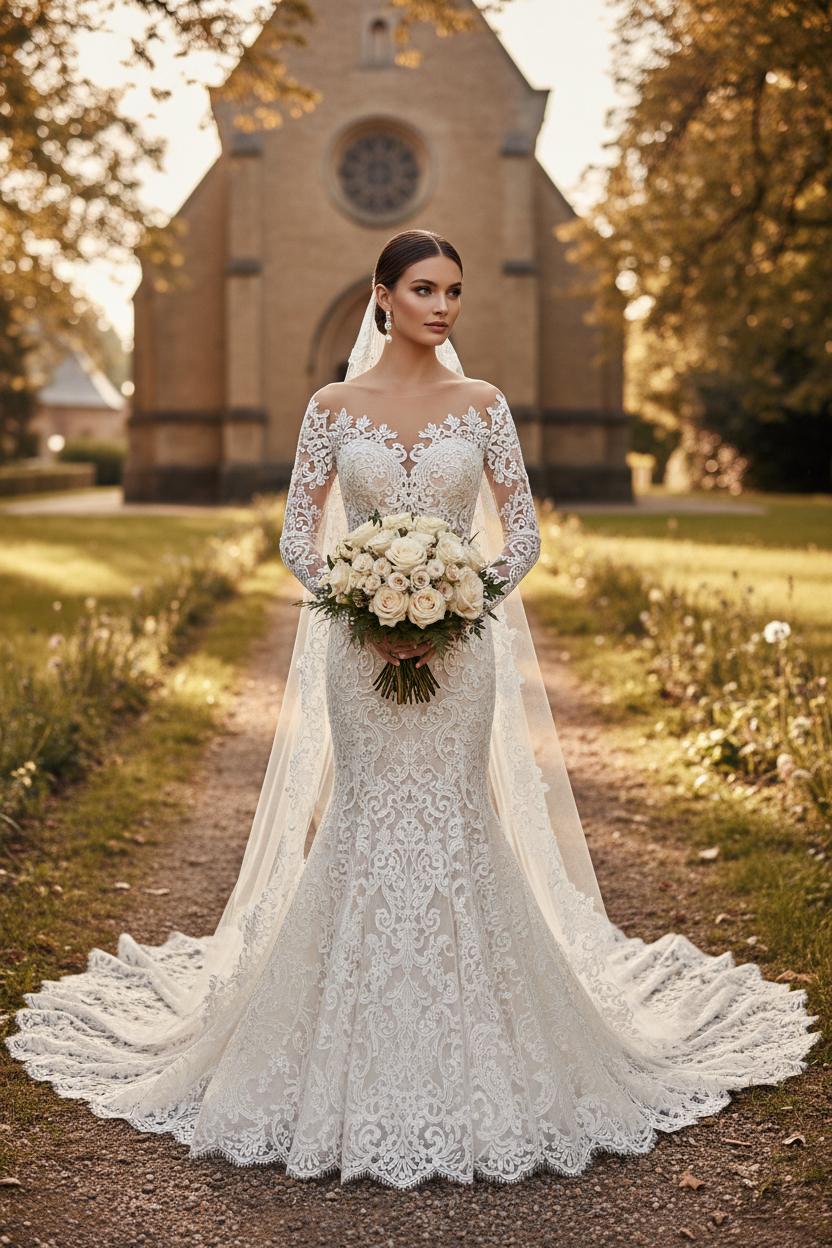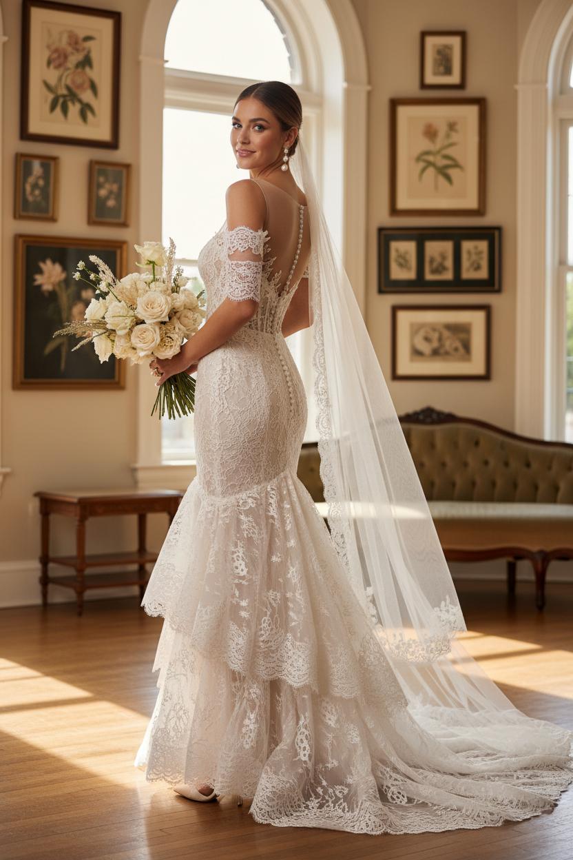 Mermaid doesn’t have to mean strictly polished. For a vintage lace dress mood, look for matte crochet patterns, eyelash trim, and a chapel train that feels like heirloom embroidery come to life. Leaning into a boho wedding dress vibe? Opt for airy skirts, botanical appliqué, and soft, unstructured waves—almost like a boho lace bridal dress translated into a curve-loving shape. Planning a fall ceremony? A long sleeve wedding dress in a fitted mermaid cut balances coverage with allure, especially with sheer lace sleeves and a subtle keyhole back. Finish with a hand-tied bouquet of garden roses or wild grasses to echo your lace motif, and choose shoes with a slim heel that disappear beneath the fluted hem. The beauty of this silhouette is how it adapts—city rooftop or seaside vows, candlelit ballroom or meadow at golden hour—always keeping the focus right where it belongs: on you, glowing, sculpted, and effortlessly graceful.
