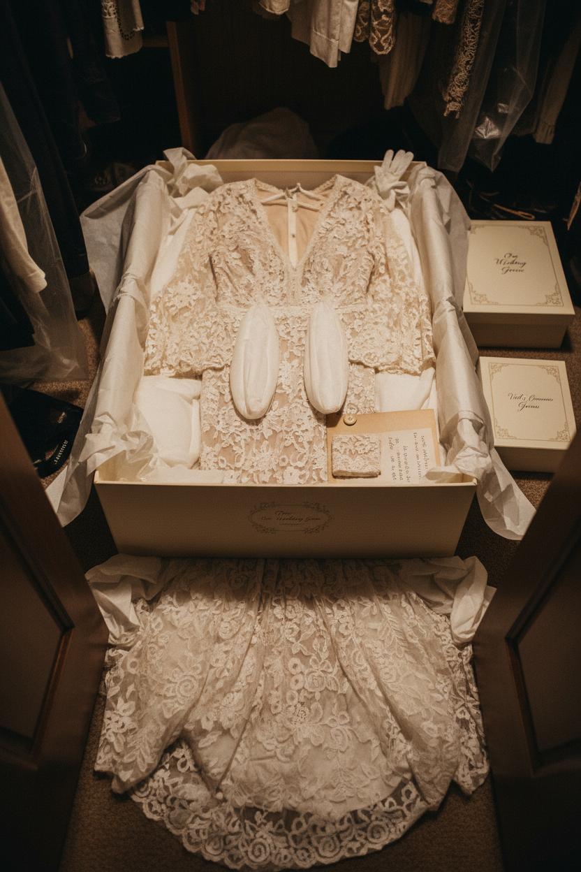 Once cleaned, choose preservation over simple storage. Skip plastic bags and wire hangers; instead, wrap your lace wedding dress in acid-free tissue, padding the bust, hips, and train so the fabric doesn’t crease sharply. An archival box or muslin garment bag in a cool, dry, dark place is best—think under-bed or interior closet, away from attic heat or basement damp. If your silhouette is fitted, support the flare of a mermaid wedding gown with extra tissue; for a boho lace bridal dress, gently stuff sleeves and fluttery hems to keep their drape. Handle it with clean hands or cotton gloves and refold every couple of years to prevent permanent fold lines. Tuck in a note with the designer, wedding date, and care method, plus a swatch if you have one; label the box so future you (or a daughter, niece, or dear friend) can find it easily. Store the veil and accessories separately to avoid snagging. Think of preservation as a love letter to the future—your gown becomes more than fabric and thread, a time capsule of joy that can be reworn, restyled, or simply adored for generations.