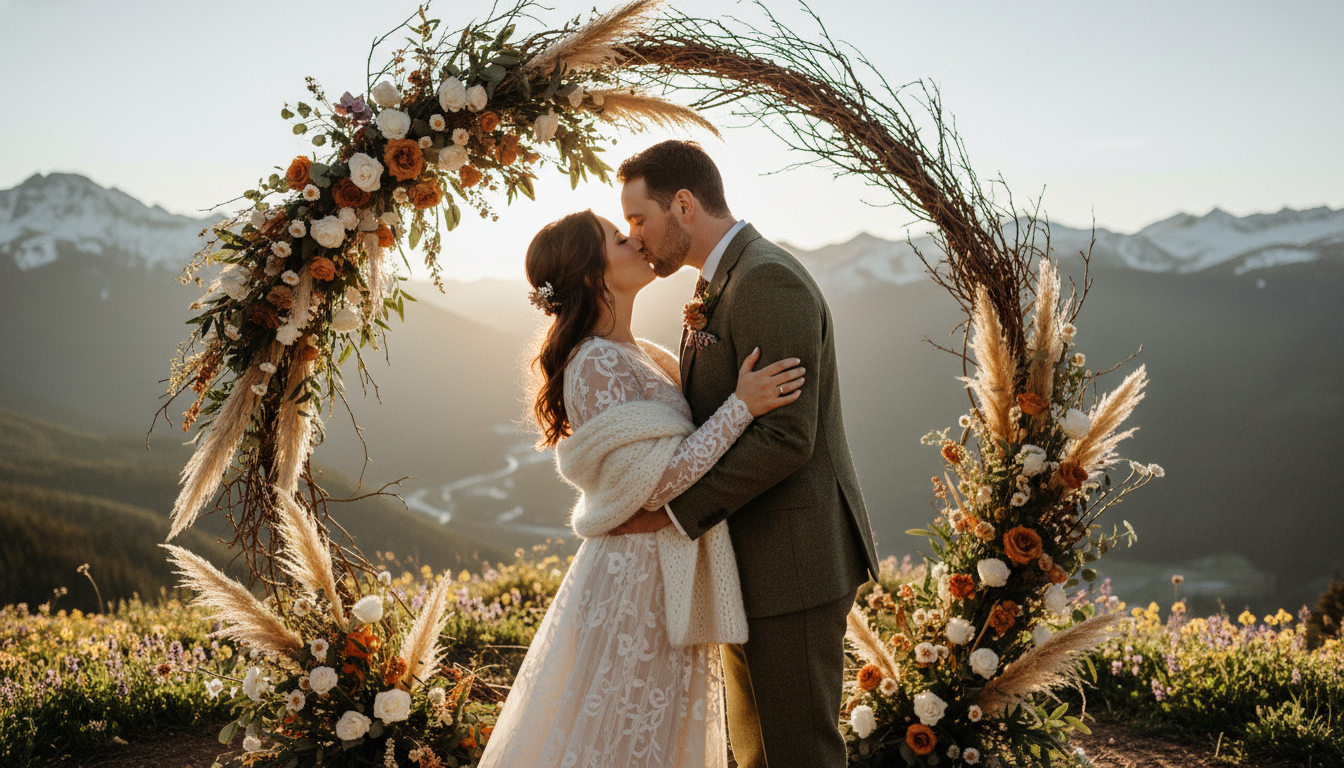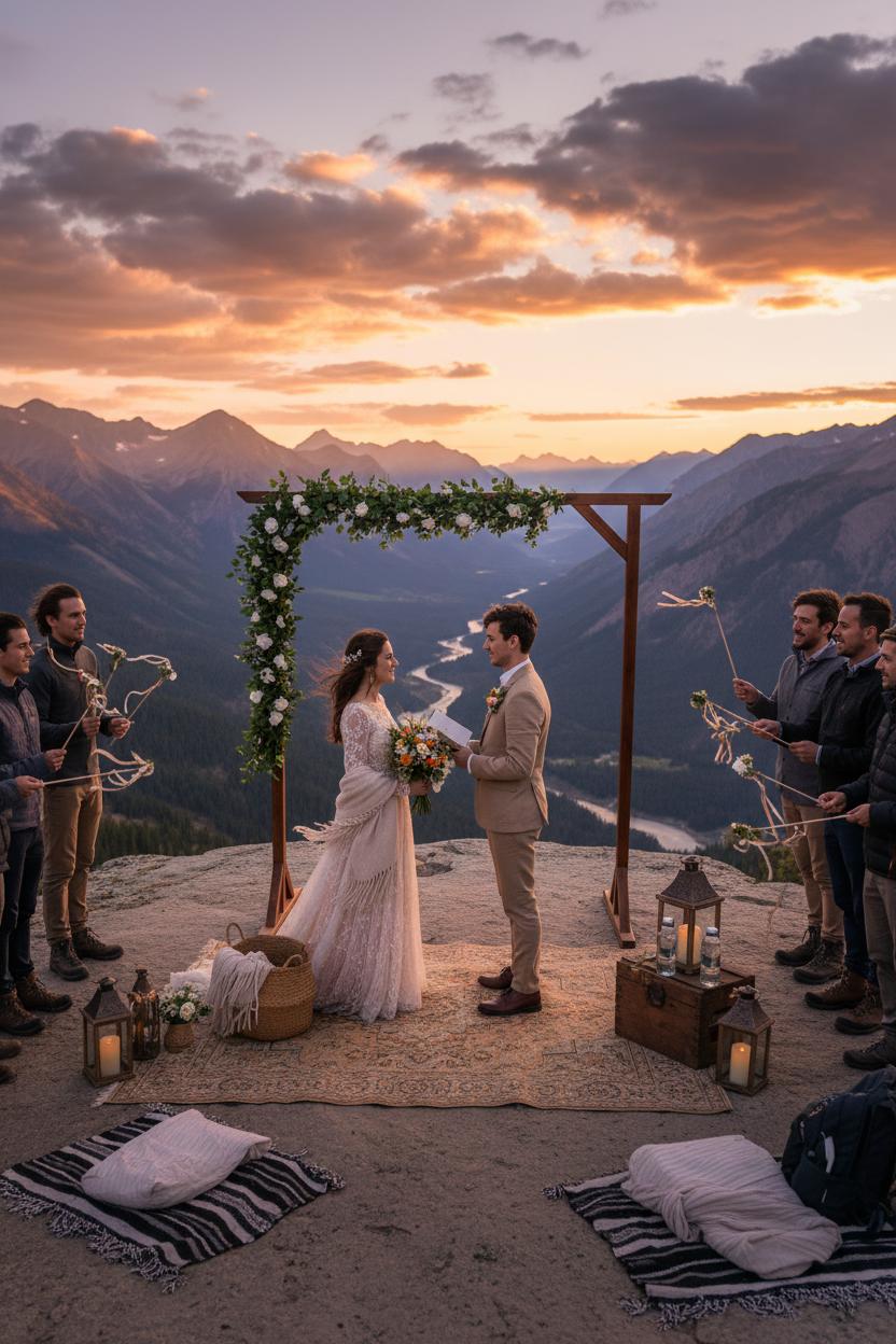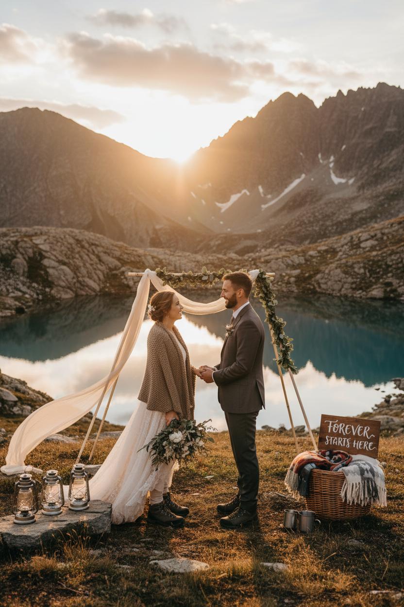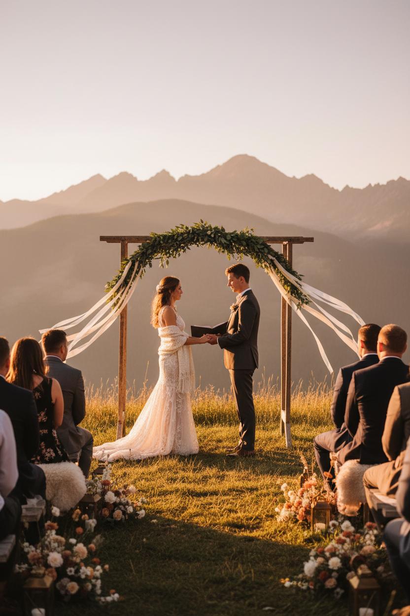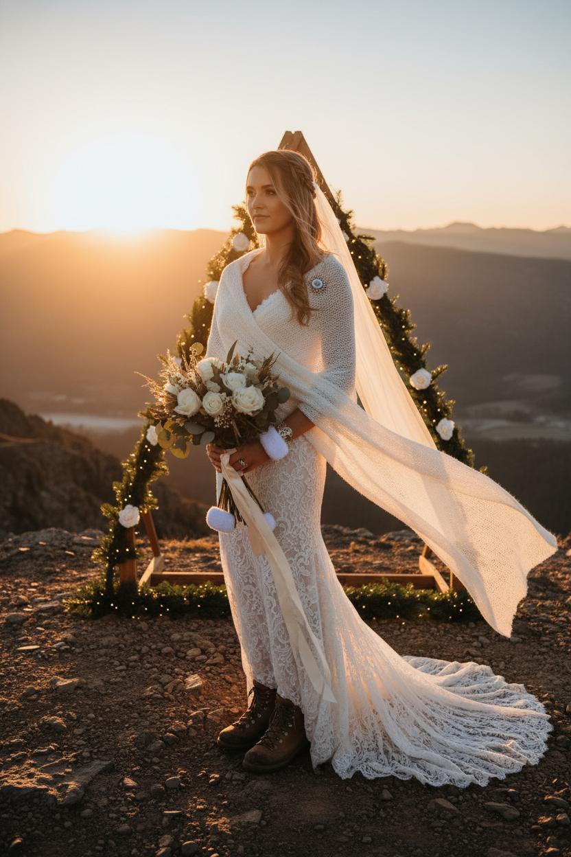 Keep your setup travel-friendly and beautiful. A portable ceremony arbor or boho wedding arch can be assembled on-site and dressed simply with ribbon and that faux greenery garland for a soft, romantic frame that doesn’t compete with the view. Think restrained mountain wedding decor—cozy blankets piled in a basket, a calligraphed sign, lanterns that glow as the sun slips behind the ridge. If the breeze is lively, whisper your private vows to each other at sunrise and share a pared-back reading at sunset for your outdoor ceremony with a few loved ones. A bridal shawl layered over your gown or suit adds warmth and a touch of old-world charm, and rugged boots beneath the hem keep everything feeling effortlessly rustic wedding chic. Celebrate with a mountaintop toast—local whiskey or sparkling water in tin cups—and tuck a sprig of alpine botanicals into your bouquet as a nod to the terrain.