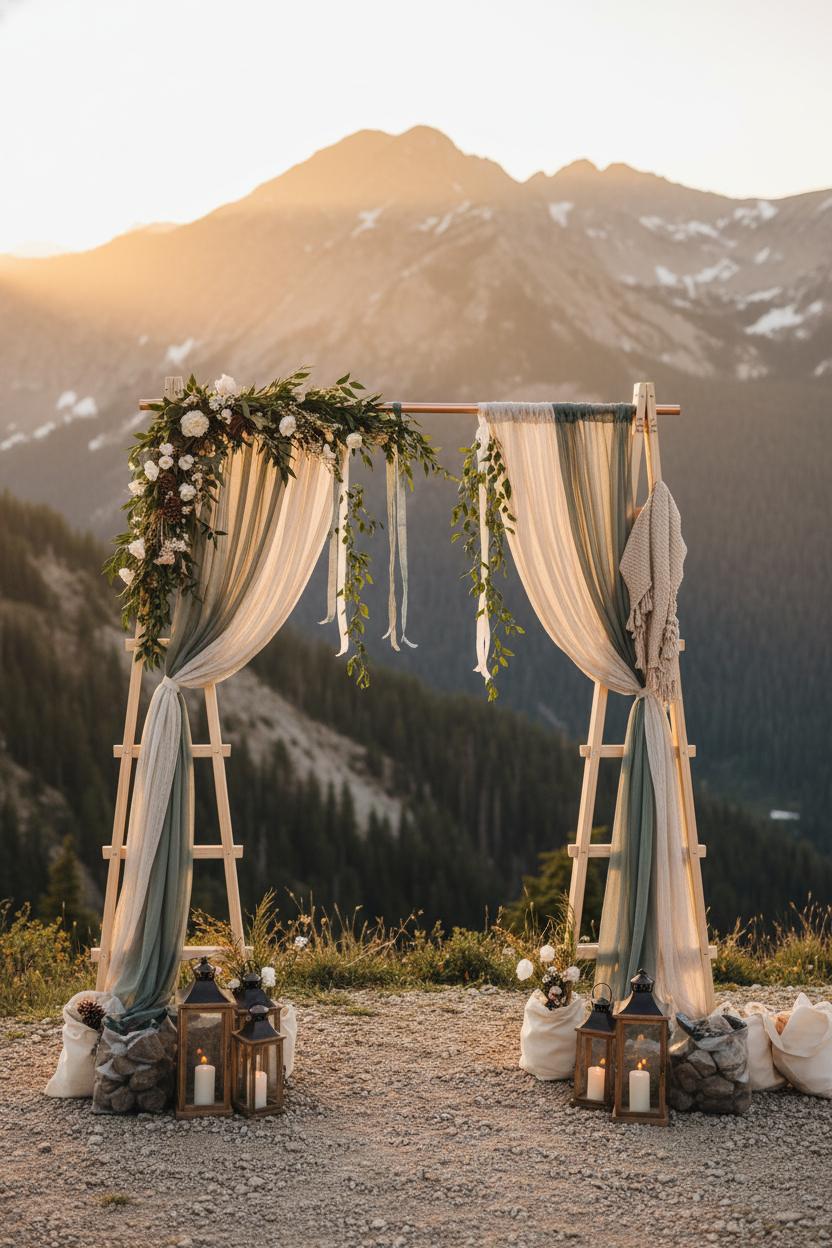 Imagine your vows framed by a soft, glowing ridge line, the kind of golden hour that wraps everything in honeyed light—this is where a portable ceremony arbor really shines. For an alpine elopement, think light, modular pieces you can assemble in minutes: collapsible wooden ladders joined with a crossbar, a simple copper-pipe frame that tucks into a daypack, or a foldable boho wedding arch with macramé or chiffon draping. The beauty of a portable ceremony arbor is how effortlessly it transforms any overlook into an intentional, intimate outdoor ceremony space while still feeling organic to the landscape. Keep your palette pulled from the peaks—mossy greens, slate blues, and warm neutrals—so the structure whispers rather than shouts, letting the mountains lead the way in your mountain wedding.