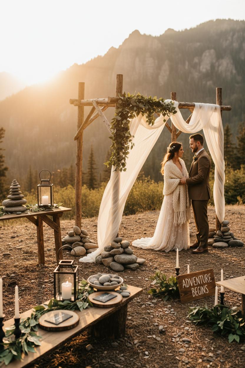 There’s something magical about promising forever while the peaks blush with golden hour light—like the mountains themselves are your only witnesses. To personalize your alpine elopement, start with a spot that tells your story: a glassy lake that mirrors the sky, a wind-kissed saddle along your favorite trail, or a hidden overlook where you watched your first sunrise together. Infuse meaning into the moment with rituals that feel like you—handfasting with a length of climbing rope, a tiny ring-warming in enamel mugs, or vow books pressed with petals from a past adventure. For a gentle, Leave No Trace approach, consider swapping fragile florals for a faux greenery garland that can be draped and reused, adding texture without disturbing the landscape. The result is mountain wedding magic that feels intimate and completely yours.