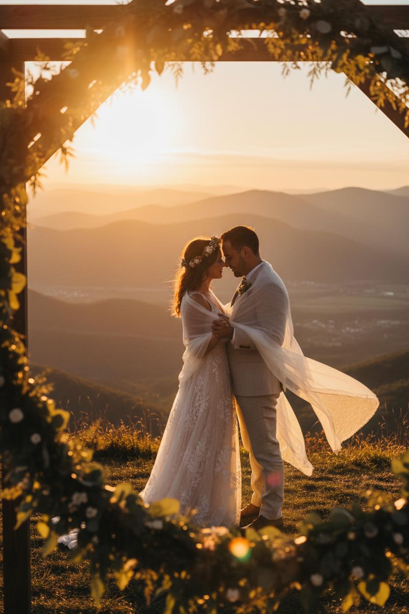 There’s a reason golden hour feels like magic at a mountain wedding—the light skims across the ridgelines, turns the air to honey, and wraps everything in a soft glow. For the dreamiest sunflares, start 20–30 minutes before sunset and face your couple toward the sun with you shooting slightly off-axis, letting the sun “kiss” the edge of a shoulder, bouquet, or boho wedding arch. Stop down your aperture to f/8–f/16 for crisp starbursts, and keep your lens spotless to avoid muddy haze. If the light is too intense, use your hand as a tiny flag just above the lens to control stray rays. Warm skin tones love this backlight, so have your couple snuggle nose-to-nose and sway—movement makes flares dance. Incorporate your mountain wedding decor as foreground texture: a faux greenery garland strewn along a portable ceremony arbor can blur into bokeh gemstones, while a gauzy bridal shawl caught by a breeze becomes a luminous filter. It’s the perfect blend of rustic wedding charm and modern glow, especially if your outdoor ceremony sits along a sweeping valley.