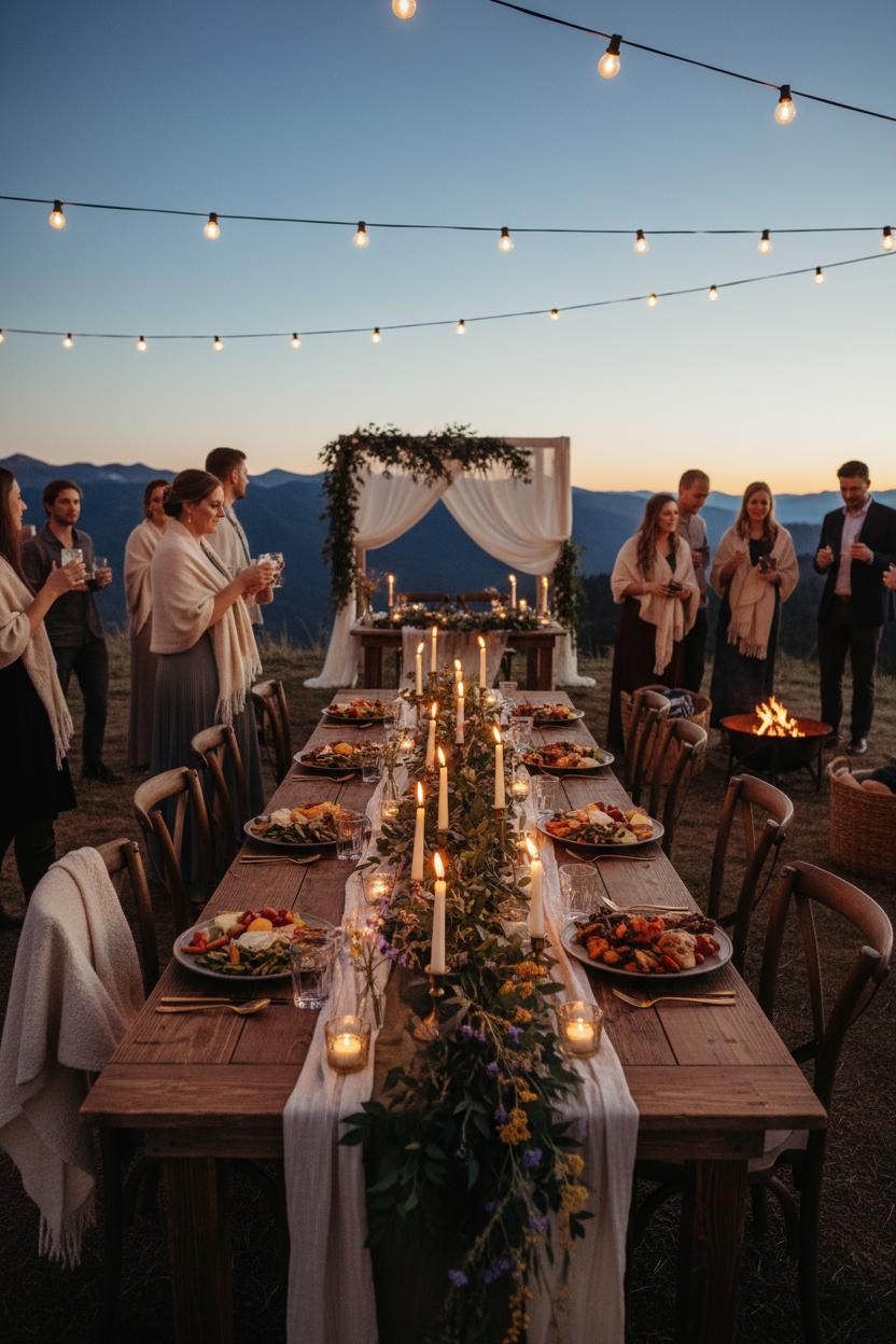 Dinner is designed for lingering. Family-style platters arrive brimming with local cheeses, stone fruit, and herb-flecked roasted vegetables, followed by cast-iron mains that feel both elegant and comforting. Signature cocktails nod to the alpine setting—spruce-tip gin fizz, rosemary palomas, or a smoky old-fashioned by the fire. As the air cools, a stash of woven throws and a cozy bridal shawl are easy to grab, encouraging guests to settle in and savor the view. Enamel mugs filled with spiced cider or hot cocoa pair perfectly with a mini s’mores station, turning dessert into a campfire moment. For an alpine elopement or an intimate guest list, scale the scene with one long table for a communal feel, or a handful of café rounds sprinkled with lanterns. Keep the palette moody and natural—moss, slate, ivory—and add petite bud vases for a collected, travel-ready approach to wedding inspiration. Practical touches matter up here: weight your candle holders, clip your linens, and let your florals breathe with the breeze. When the last light fades and the stars take over, your ridge-top reception becomes a memory stitched with warmth—proof that a mountain wedding can be both wildly scenic and wonderfully cozy.