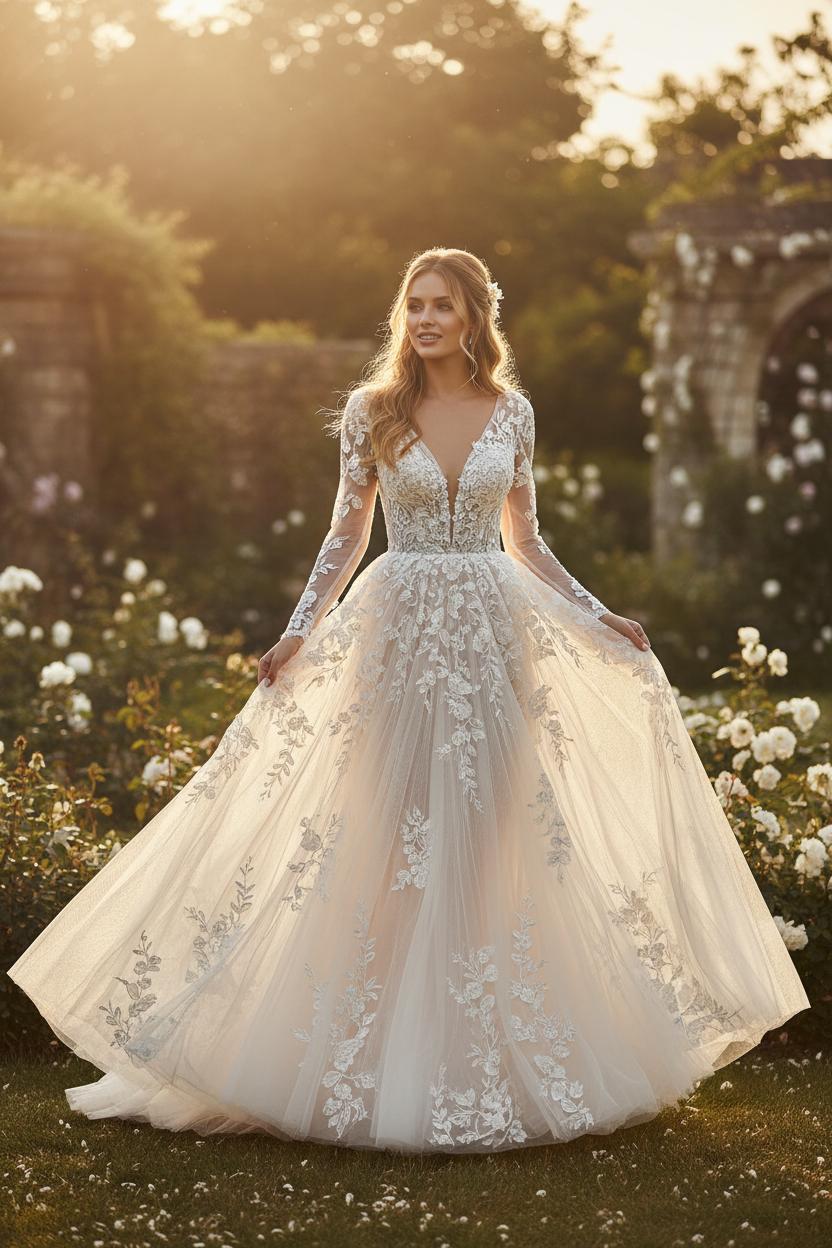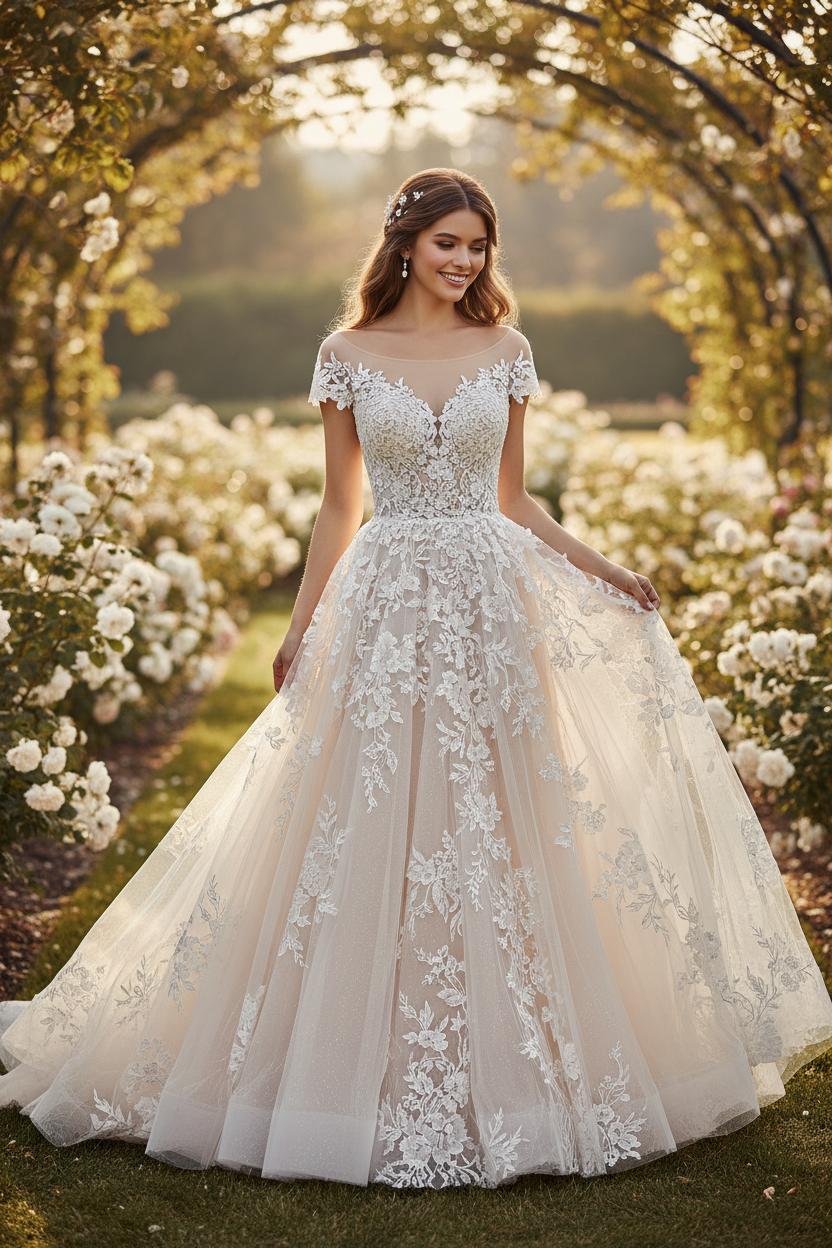 Imagine stepping into a gown that feels like morning light caught in fabric—soft, luminous, and endlessly romantic. This is the magic of an ethereal romantic wedding dress crafted with lace and tulle: the way the skirt drifts behind you like a sigh, the way the lace trails over your shoulders like wildflowers pressed in a love letter. For the ethereal bride who wants her look to feel effortless yet unforgettable, the balance of delicate detailing and cloudlike movement is everything. A lace wedding gown adds a timeless, heirloom quality, while airy layers of tulle lend that floaty, fairytale finish you’ve pinned a hundred times. Think whisper-soft textures, a touch of barely-there sparkle, and floral appliqués that look hand-picked from a sunlit garden. The result is a tulle bridal gown that feels classic and modern all at once—poetry in motion, ready for your walk down the aisle.