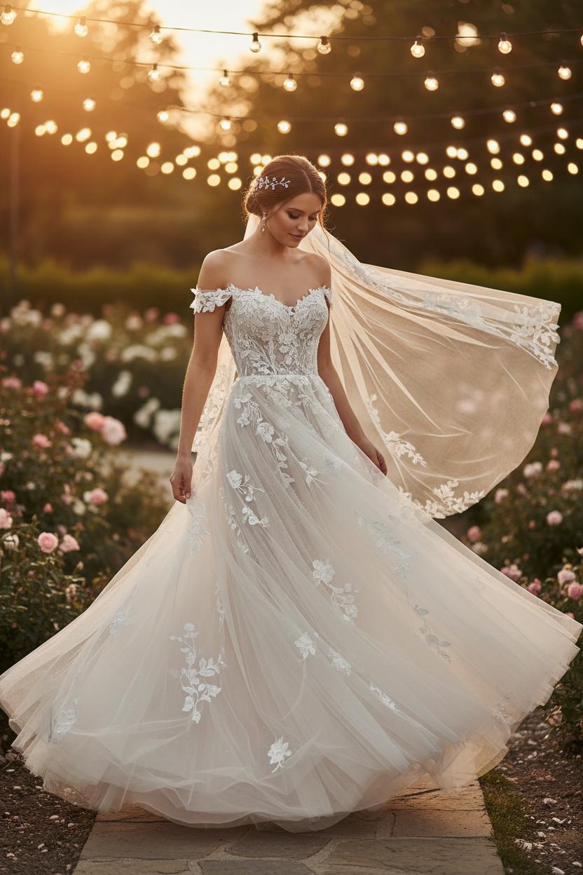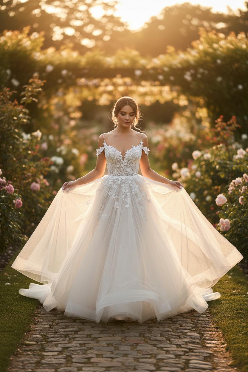Details are your secret styling power. Detachable sleeves or lace appliqués let you shift from ceremony to dance floor with ease, and a fingertip veil keeps things ethereal without competing with the skirt. Budget for a petticoat if you want extra volume and for steaming on arrival. When searching marketplaces, try terms like romantic wedding dress, lace wedding gown, off shoulder bridal dress, A-line wedding dress, or tulle wedding dress to filter quickly. Most of all, listen to how the dress makes you feel—when the fabric floats, the lace whispers, and you see an ethereal bride looking back, you’ve found the one.