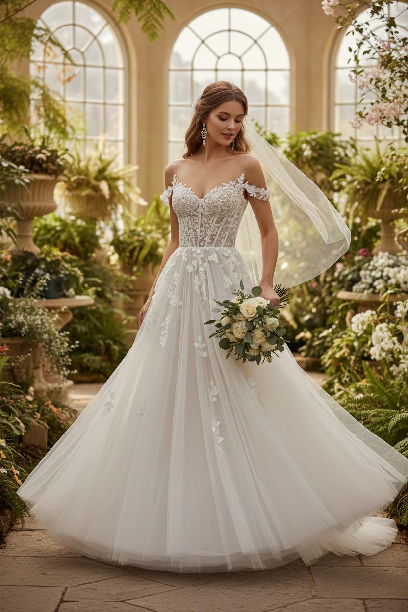Details make the magic. A lace wedding gown with illusion straps offers gentle coverage while highlighting your shoulders; an off shoulder bridal dress draws the eye upward for a swan-like neckline and the dreamiest portrait photos. Prefer extra support? Look for boned corsetry beneath the lace, then let the skirt drift into soft tulle for that cloudlike finish. A chapel or sweep train on an A-line wedding dress adds romance without overwhelming your walk down the aisle—or your dance floor twirls. The beauty of this silhouette is how easily it adapts: a sleek satin belt to define the waist, floral appliqués scattered over a tulle wedding dress for garden-party whimsy, or pearl buttons trailing down the back for a timeless touch. Style it with a fingertip veil and loose waves for an ethereal bride vibe, or add crystal drop earrings and a low chignon for polished elegance. If you love the idea of a lace-meets-tulle look that photographs beautifully from every angle and feels comfortable from vows to last dance, an A-line bridal dress is a graceful yes. It’s the wearable fairytale—light on your body, big on romance, and endlessly re-wearable in your memories.
