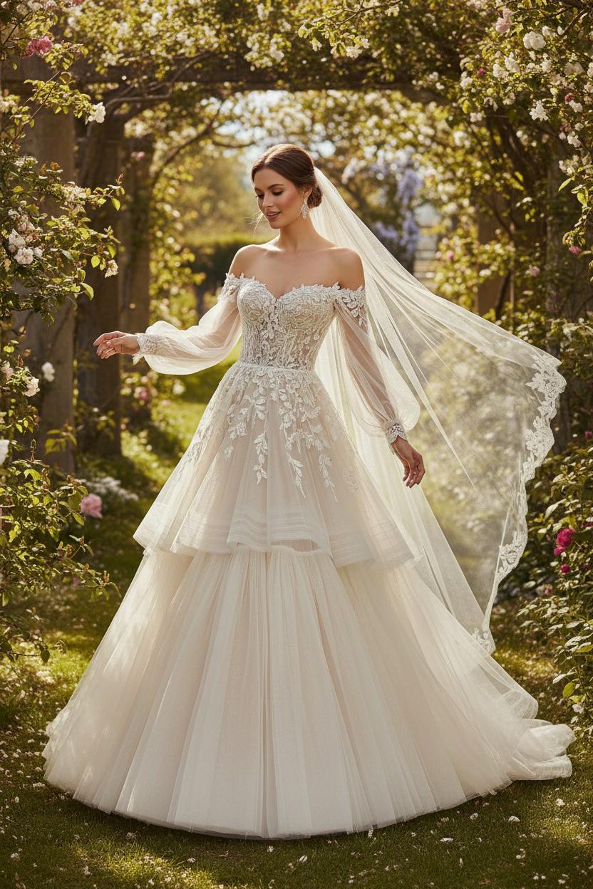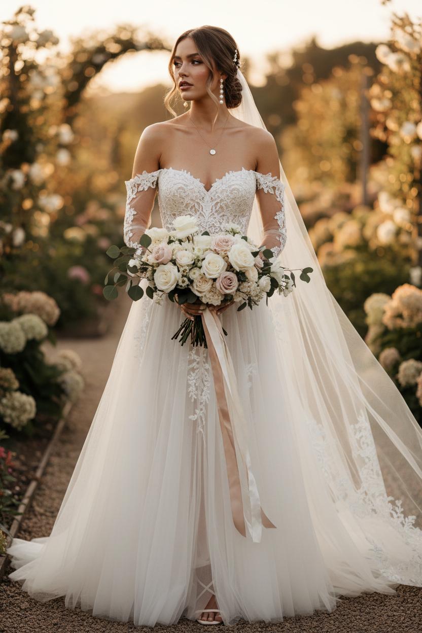 There’s an easy, effortless charm that happens the moment an off shoulder bridal dress skims the collarbones—the neckline feels like poetry, especially when paired with a lace wedding gown and layers of cloud-soft tulle. Off-the-shoulder styling works beautifully on an A-line bridal dress, gently defining the waist while letting the skirt float for that ethereal bride aura. Keep hair soft and undone: think a loose wave swept behind one ear, or a low, romantic chignon with pearl pins. Let your decolletage breathe with delicate jewelry—shoulder-grazing earrings or luminous drops are stunning—while a bare neck or the lightest whisper of a chain keeps things modern. For veils, mirror the textures of your tulle bridal gown with a fingertip veil for airy movement or go dramatic with a cathedral-length veil edged in lace that echoes the motifs of your romantic wedding dress. A silk ribbon at the waist can add definition without competing, and sheer opera gloves bring an instant couture moment.