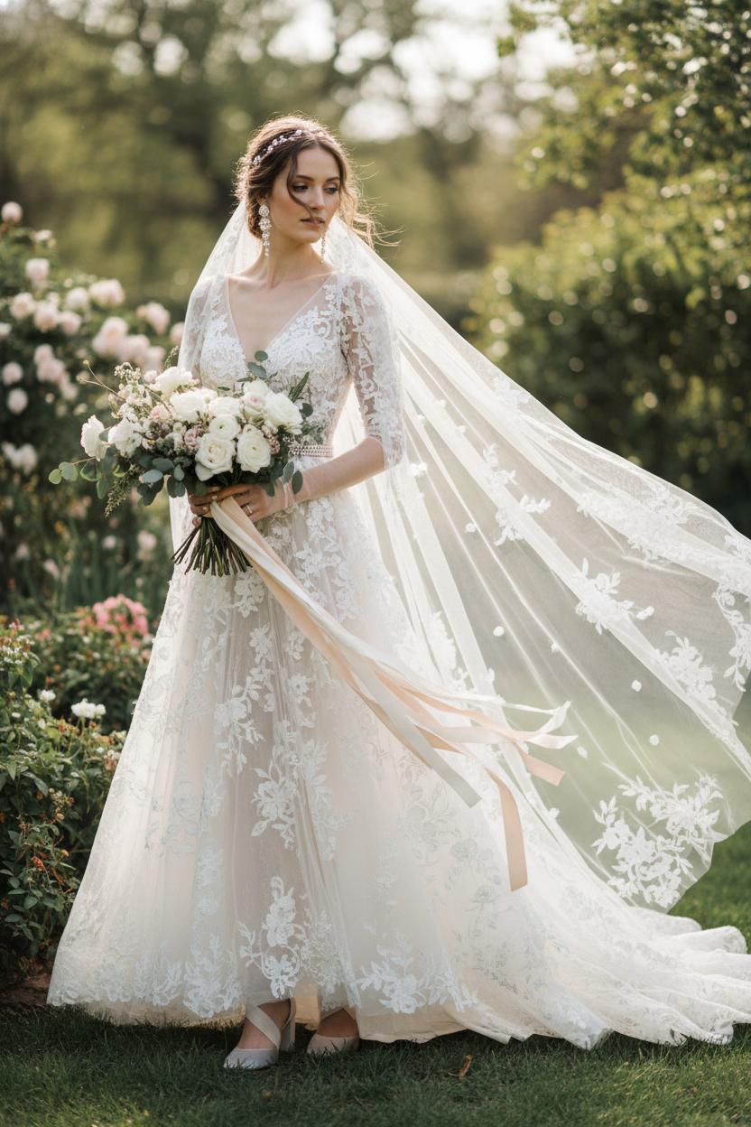 When your look starts with a romantic wedding dress spun from lace and whisper-light tulle, the veil becomes the finishing brushstroke. For the ethereal bride, try a cathedral-length veil with soft, scattered appliqués that echo the motifs of a lace wedding gown, letting the edges trail like morning mist behind you. If you’re planning a garden or beach ceremony, a fingertip veil in raw-cut tulle feels cloudlike and effortless, especially over an A-line bridal dress that floats as you move. A short, sheer blusher adds an old-world hush to your entrance without hiding the delicate details of a tulle bridal gown. Love a little sparkle? Consider barely-there crystals or pearly pinpoints sprinkled through the veil—think starry-night shimmer that catches the light as you turn. And if your gown’s bodice is richly textured, choose a simpler veil so the lace can sing; if your dress is sleek and clean, a scalloped lace edge can bring romance to the frame of your face.