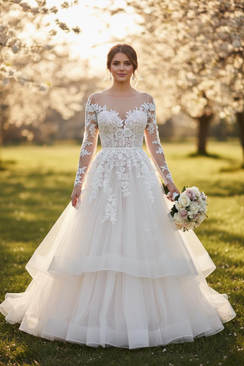 Silhouette matters, too, and that’s where the A-line bridal dress truly shines. Its gentle structure defines the waist and skims the hips, giving you that dreamy swish with every step—perfect for golden-hour portraits and twirling under string lights. Whether you lean toward an off shoulder bridal dress that frames the collarbone or prefer an illusion neckline with lace vines and tiny pearl buttons, the details are designed to flatter and photograph beautifully from every angle. You might choose a tulle wedding dress with a chapel-length train for a soft, sweeping entrance, or an A-line wedding dress with layered skirts that catch the breeze like petals in motion. Paired with a veil that echoes your lace motifs, the entire look becomes a cohesive story—romantic, airy, and deeply you. In this chapter of your love story, a lace wedding gown with tulle is more than a trend; it’s a feeling you wear, a gentle glow that follows you, and the kind of bridal style that lingers in memory long after the last sparkler fades.