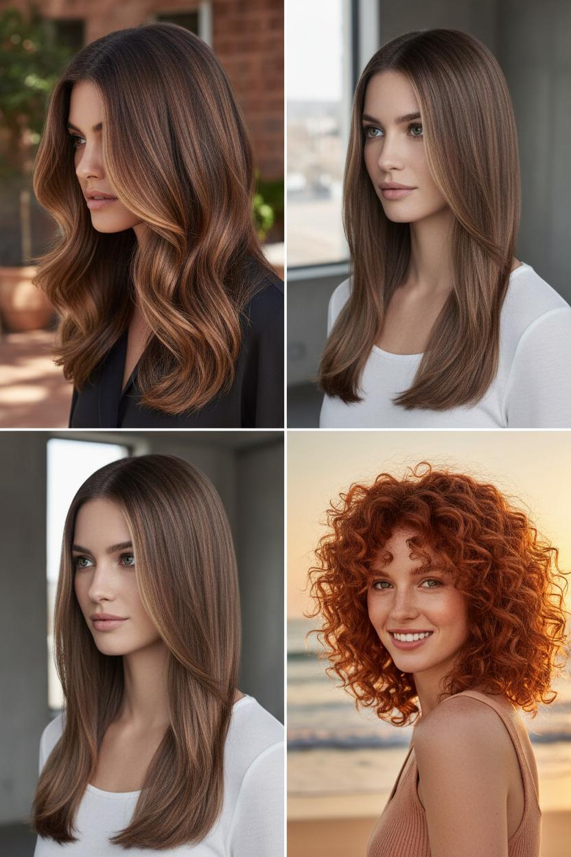 Ask your colorist for a neutral-cool brown base with airy, diffused balayage highlights a level or two lighter, then a toner that leans taupe-beige to cancel orange while keeping the vibe cozy. If you flirt with copper hair in fall but want something more understated, mushroom brown gives you that chic, modern counterpoint—keep it cool overall and, if you must, weave in the faintest whisper of warmth around the face for balance. The result is lived-in, low-maintenance, and seriously photogenic; it works just as well sleek and glossy as it does in loose waves, and it plays nicely with face-framing pieces, midlength shags, and long layers alike.