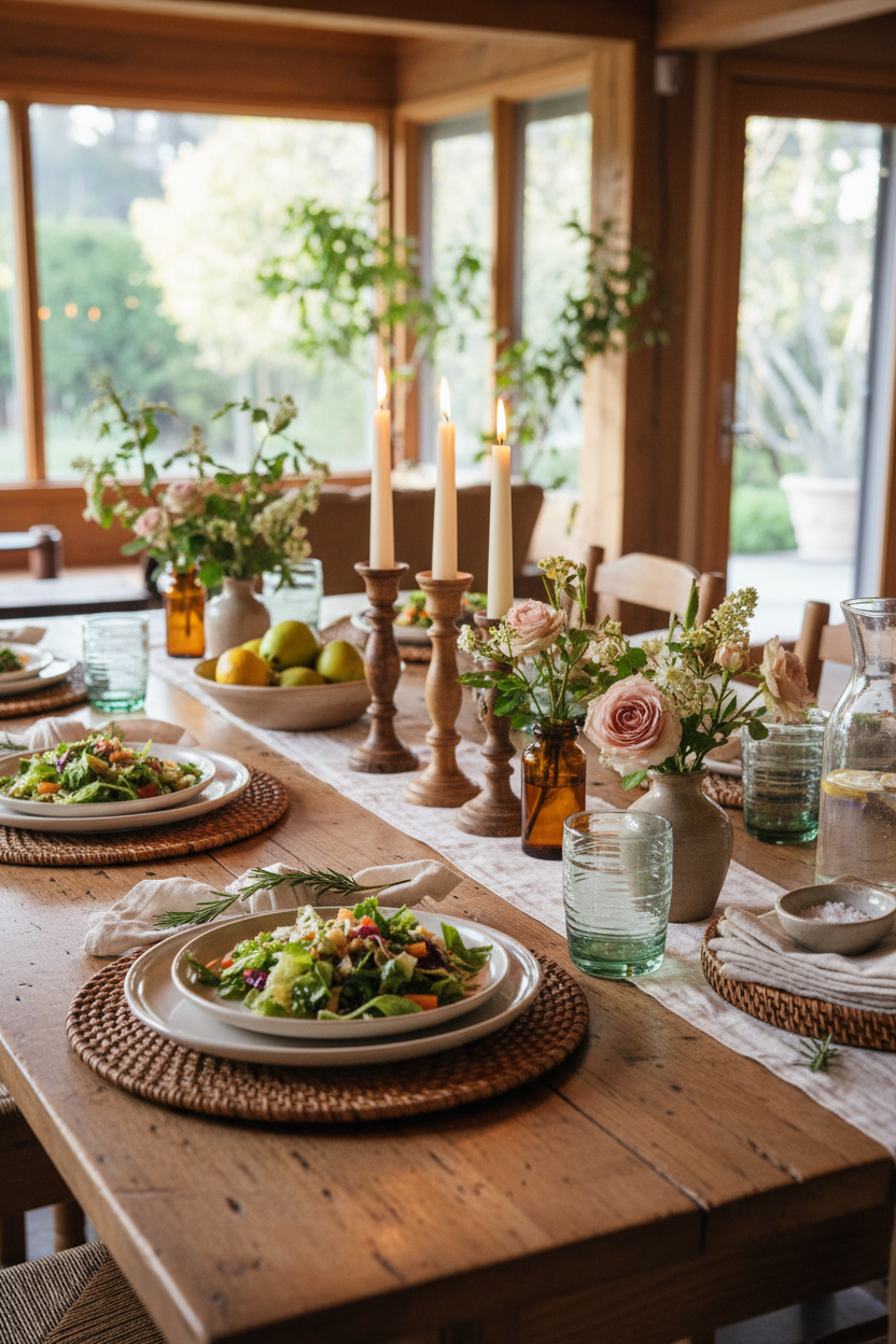 Because rattan has a neutral, natural soul, it plays so nicely with other tactile details. A few recycled glass tumblers catch the light and lend a gentle sparkle that keeps everything feeling airy and fresh, while wooden candlesticks add sculptural height without feeling fussy. If your rustic dining table has knots and grain you adore, let it show; rattan frames the wood rather than covering it, and the layered textures become the star. These small choices add up to eco friendly table decor that looks elevated but still easy—precisely the kind of organic tablescape ideas that make guests feel at home.