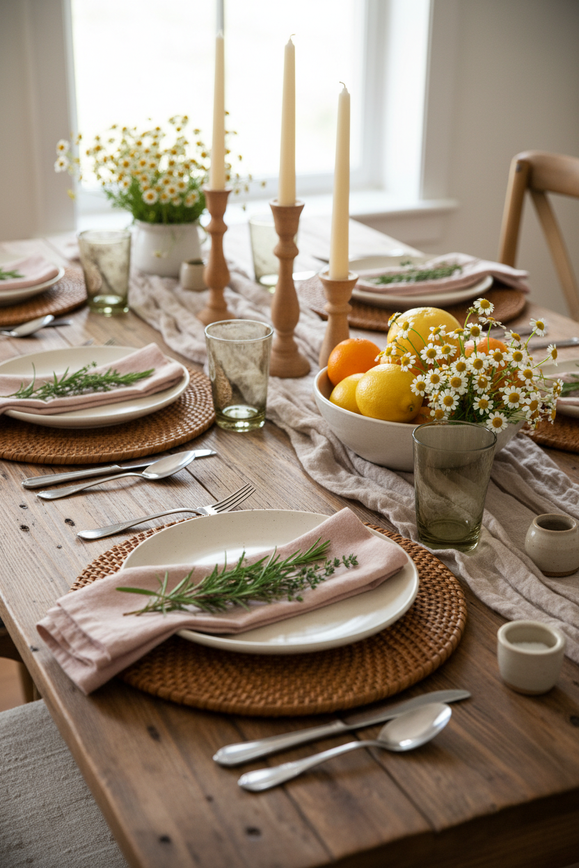 When the days lengthen and the market stalls brim with tender greens and citrus, I love leaning into organic tablescape ideas that feel effortless and joyful—perfect for spring entertaining without fuss. Start with a simple foundation: a rustic dining table left mostly bare so the wood’s grain becomes part of the story, or a loose linen runner that puddles at the edges for a relaxed, sun-washed look. Keep the palette soft and garden-inspired—sage, buttercream, clay, and blush—then weave in small, lively moments with seasonal blooms and foraged greenery. Think natural table settings that feel collected, not staged: a tumble of wildflowers in a jar, a tiny fern at each place, a few lemons or apricots scattered like confetti.