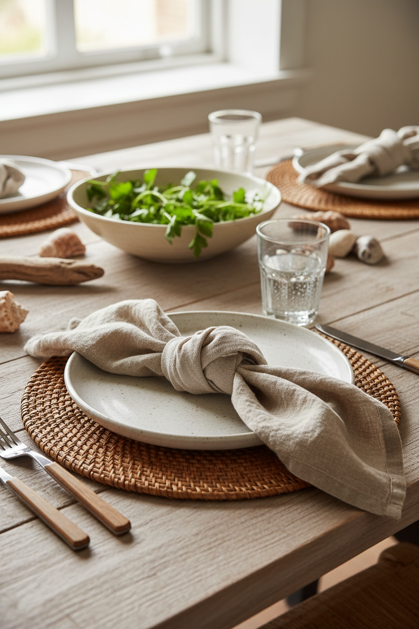 When you want your natural table settings to feel effortless yet intentional, start with the softest touch: linen napkins folded with personality. Think of them as little fabric moments that set the tone before anyone lifts a fork. On a rustic dining table layered with rattan chargers and stoneware dinner plates, a relaxed knot says “kick off your shoes and stay awhile.” Simply fold your linen napkins into a long band, knot loosely, and let the tails trail off the edge of the plate for a breezy, coastal vibe. For something more tailored, try a slim envelope fold that tucks neatly under the plate rim—perfect for holding a handwritten place card or a clipped sprig of rosemary. Hosting brunch? A gathered bow is charming for spring entertaining; cinch the center with twine or ribbon and perch it on the plate like a gift. If your style leans earthy, drape a napkin diagonally across the charger and pin it in place with your flatware; the casual layers pair beautifully with recycled glass tumblers and the warm glow of wooden candlesticks.