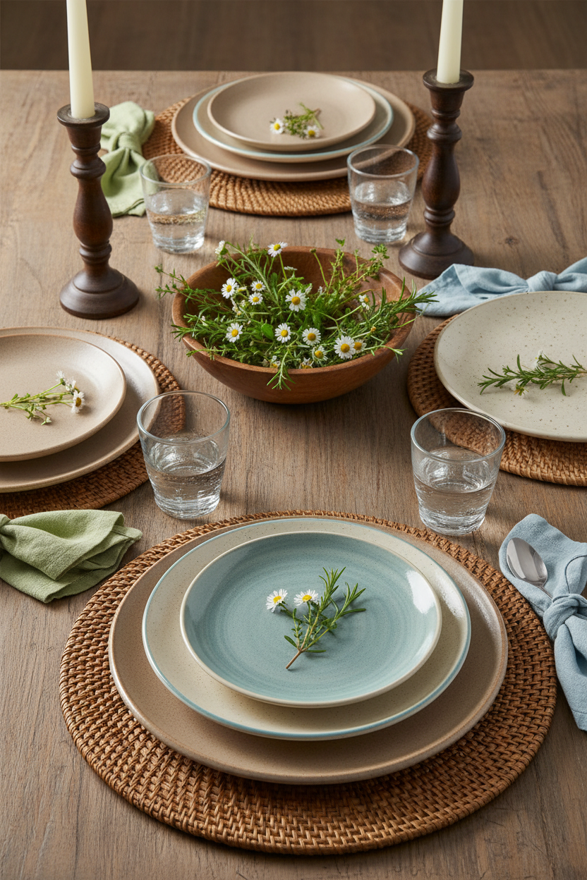 There’s something instantly relaxed and welcoming about a stack of mix-and-match stoneware dinner plates, each one a little different, all of them working together like old friends. Instead of a perfect set, think of a palette: soft clay, oat, and speckled cream with a hint of sea-glass blue. Pair matte finishes with a faint gloss, scalloped edges with simple rounds, and layer them over rattan chargers to anchor the look with warmth. On a rustic dining table, this blend of textures creates natural table settings that feel collected, not curated. Let the plates be the quiet stars, then echo their tones with loosely tied linen napkins, maybe a gentle stripe or a washed pastel to keep things breezy. The charm is in the conversation between elements—subtle flecks, imperfect rims, slightly varied silhouettes—each place setting a tiny still life that feels lived-in and loved.