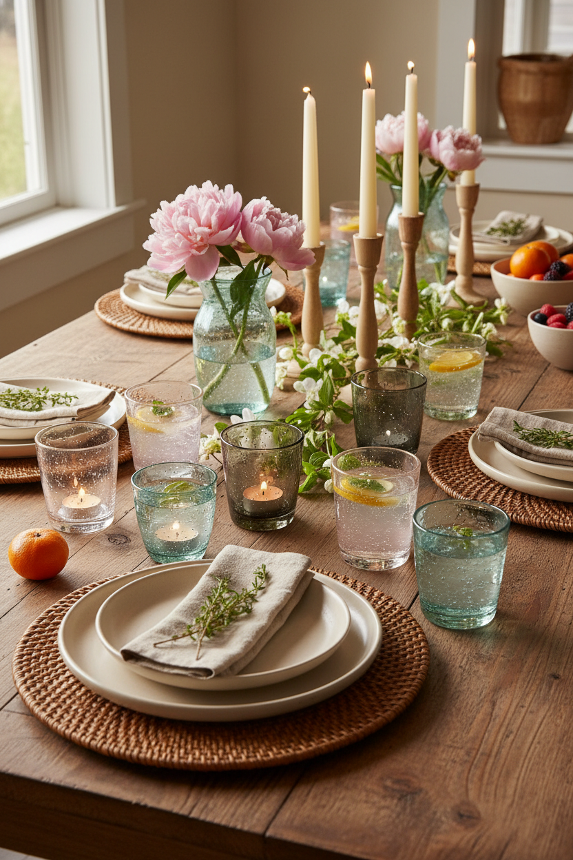 To let the sparkle really shine, start with grounding layers: rattan chargers to add warmth and weave, stoneware dinner plates with a matte finish to contrast the gloss, and loosely folded linen napkins that soften every place setting. On a rustic dining table, those recycled glass tumblers become the jewel tones—scatter them down the center like little pools of color between low garden clippings and a few slender wooden candlesticks for twinkly height. I love mixing in a couple of tumblers as miniature vases or tealight holders, too—the light bouncing through the glass turns the whole table into a gentle shimmer. For spring entertaining, build a palette around what you plan to pour: pale pink rosé spritzers next to blushed peonies, citrus water beside bowls of clementines, herb-infused lemonade with tiny bundles of thyme tied onto napkins. The best part is how effortless it feels: durable, dishwasher-friendly pieces you’ll reach for daily, yet charming enough for a celebration. If your cupboard is a patchwork collection, even better—the beauty of these glasses is in the mix, and the more personality you layer in, the more inviting your table becomes. Raise a sparkling sip and let the rest of the evening flow.