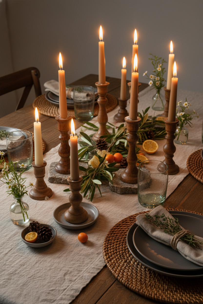 To style them the natural way, think about the story of your glow. Layer candles in soft creams and clay tones, then weave in foraged bits—seeded stems, tiny pinecones, or citrus leaves—keeping your centerpiece low so it never blocks conversation. Nestle the bases on small ceramic saucers or stone coasters to protect the wood, and let a little wax drip for patina if that’s your vibe. Tie linen napkins with twine and a sprig of thyme, and let the light skim across the table to highlight the pleasant contrasts: the silky napkins, the grain in the candlesticks, the hand-thrown character of stoneware dinner plates, the watery clarity of recycled glass tumblers. For spring entertaining, a few bud vases with wildflowers or garden snips feel fresh without competing, while sliced lemons or whole kumquats scattered between holders add brightness and scent. It’s one of my favorite organic tablescape ideas because it’s simple, soulful, and adaptable—swap in seasonal greens, change taper colors, or trade the runner for woven placemats. With wooden candlesticks guiding the ambiance, the whole tablescape hums with warmth, proof that the best natural table settings rely on texture, light, and a thoughtful mix of humble materials.