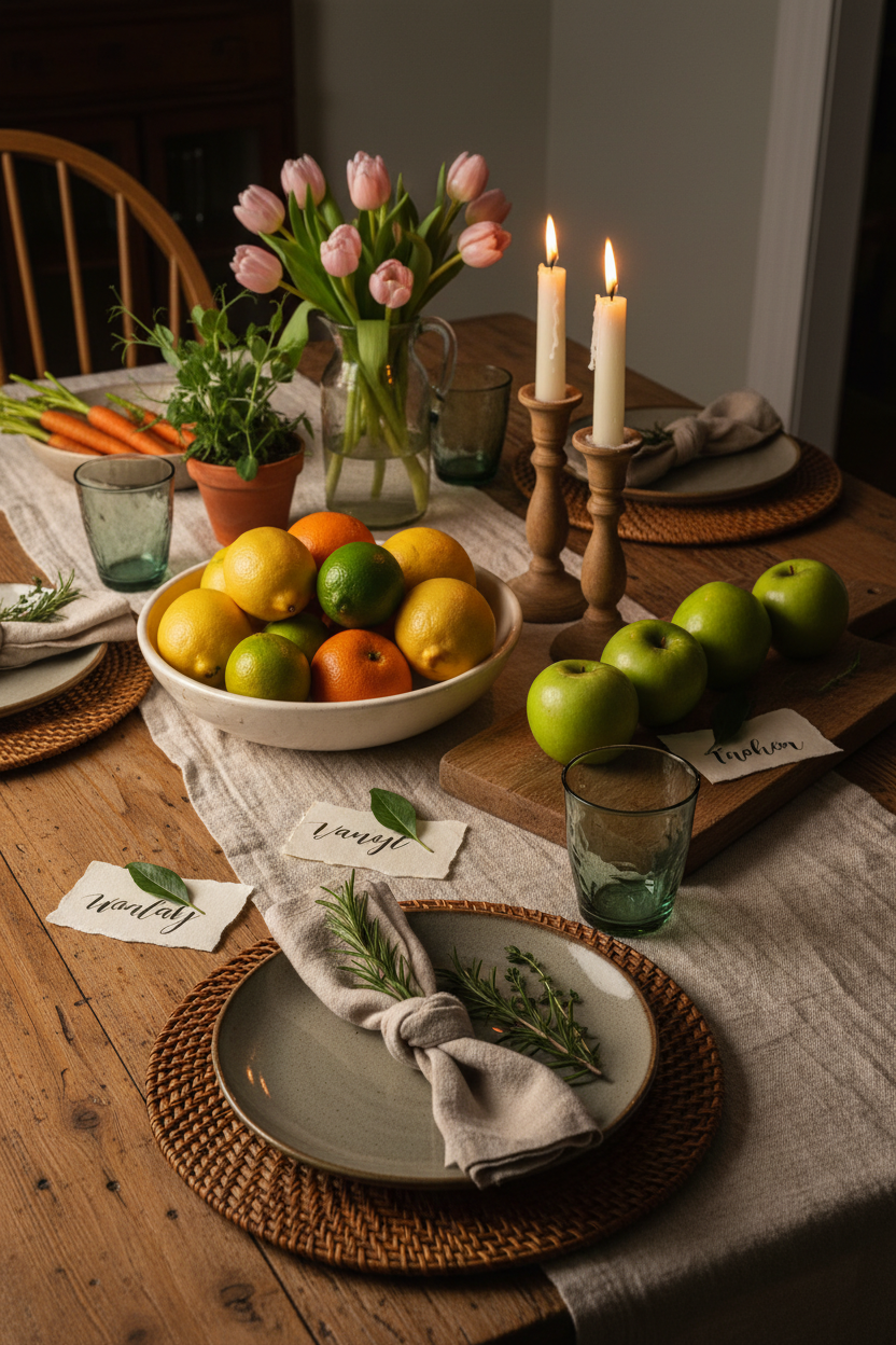 For easy organic tablescape ideas, shop your home and the produce drawer. A shallow bowl mounded with citrus, a handful of garden clippings in a jar, or a row of apples lined up down the middle reads chic and intentional. Repeat colors and textures—think green herbs, pale linen, warm wood—so even a quick pull-together feels cohesive. For place cards, tear bits of paper, write names, and anchor them with a leaf or a clipped sprig; it’s charming and totally eco friendly table decor. Keep the palette soft for spring entertaining: blush tulips in a jug, pea tendrils trailing from a small pot, or baby carrots with their tops in a low dish. Dim the lights, let those candles glow, and you’ve got a table that looks considered without being precious. The secret is restraint—two or three strong elements repeated across the surface. In minutes, you’ve built a scene that invites guests to exhale, pass the bread, and linger. Whether it’s Tuesday pasta or a weekend roast, these quick layers make any meal feel special, proving that the best natural table settings are simple, tactile, and ready for real life.