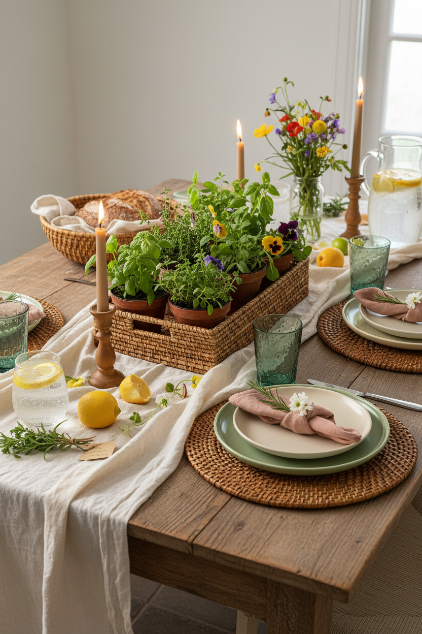 Layering brings warmth. Set rattan chargers under matte stoneware dinner plates to add depth and texture, then knot linen napkins casually and tuck in a sprig of rosemary or a fragrant blossom. Mix in recycled glass tumblers—their subtle bubbles and sea-glass hues catch the light and make water or a spring spritz feel extra special. Candlelight softens everything, so cluster wooden candlesticks with beeswax tapers down the table; vary heights for a flicker that dances at eye level. For eco friendly table decor, trade cut flower centerpieces for potted herbs you can later plant, nestle them in a woven tray, and thread a few edible blooms between pots for a touch of whimsy. Handwrite place cards on seed paper or tie a tiny tag around an herb bundle for a favor that keeps growing.