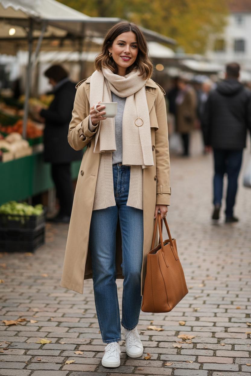 One of my favorite fall outfit ideas is to layer a boxy cardigan under the trench, loop the scarf once, and tuck the ends slightly into your coat—it looks styled but never fussy. Hair tucked into the scarf reads chic and cozy, and a swipe of tinted balm is all you need. Heading into evening? Keep the denim and scarf, switch sneakers for ankle boots, and you’re set. Simple, warm, and endlessly wearable—that’s the magic of knowing how to style a scarf on the weekend.