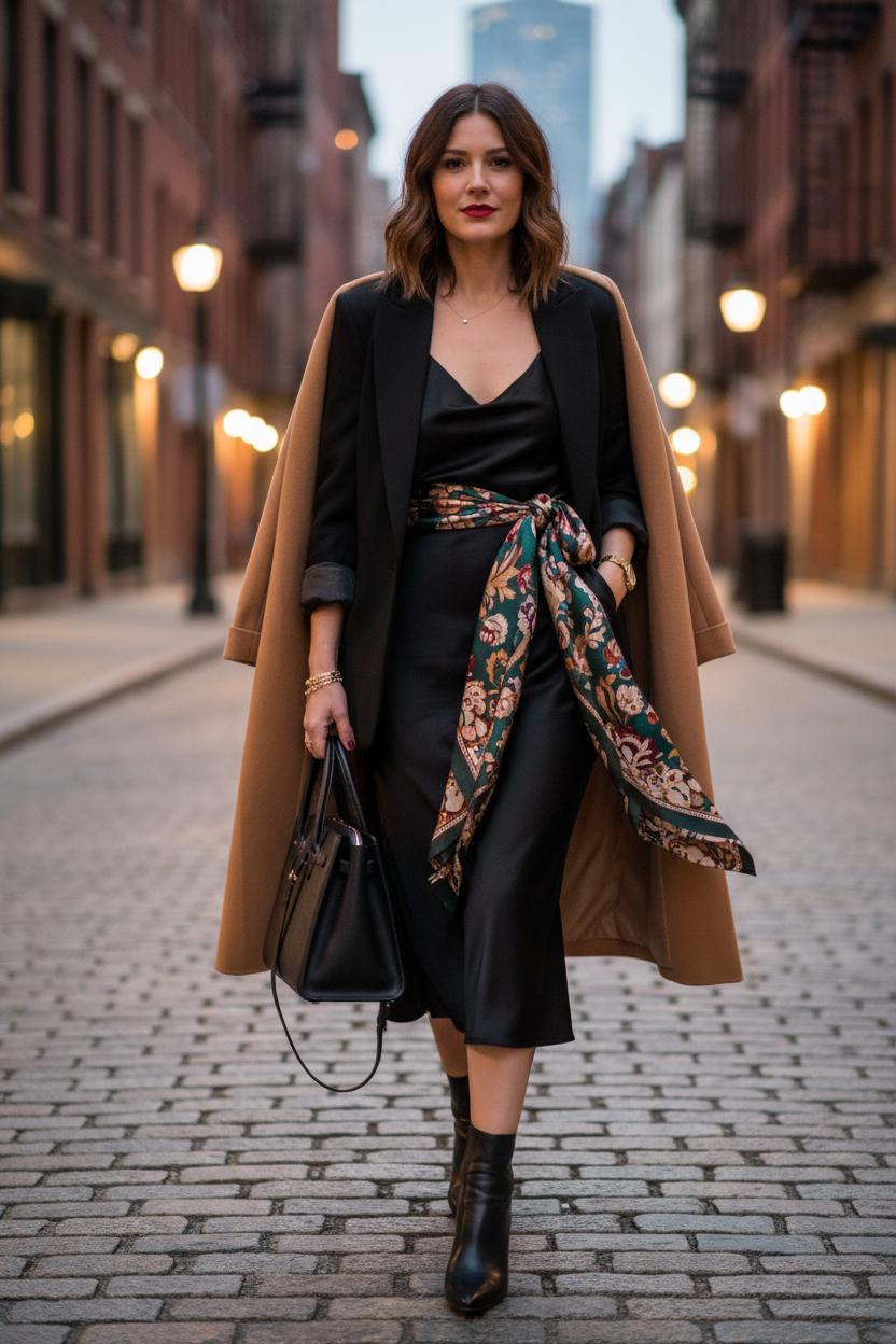For a date-night twist that feels equal parts polished and sultry, cinch a slinky slip dress with a silk scarf and top it with a tailored blazer. The scarf becomes your secret style switch: fold it into a long ribbon, wrap it around your natural waist, and knot it slightly off-center so the ends trail with a little romance. Choose a print that echoes your dress or blazer—think soft florals with satin or a graphic stripe against a classic black slip—and let the colors tie your whole look together. The combination of fluid fabric and sharp structure is irresistibly chic, and if you’ve been wondering how to style a scarf in a way that instantly elevates, this is it. Consider this your go-to scarf outfit when you want easy glamour without trying too hard.