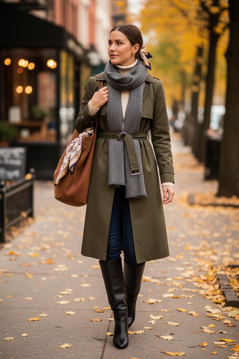 When the air turns crisp and the sidewalks are dotted with golden leaves, I reach for my favorite easy formula: a classic trench coat, a plush wool scarf, and sleek knee-high boots. It’s the kind of scarf outfit that feels effortless but always looks pulled together. Start with a neutral trench—camel, stone, or deep olive—and wrap a heathered wool scarf around your neck once, letting the tails fall long to elongate your frame. If you’re wondering how to style a scarf so it stays neat and chic, slide the fabric through a simple scarf ring at your collarbone; it adds a tiny bit of shine and keeps everything in place as you move. Underneath, layer a ribbed turtleneck and dark denim, or swap in a knit midi dress and opaque tights for a softer vibe. Finish with knee-high leather boots to balance the volume of the scarf with a sleek line through the leg. Color-wise, think latte and charcoal, cinnamon and cream, or navy with a touch of camel—tones that echo the season without shouting.