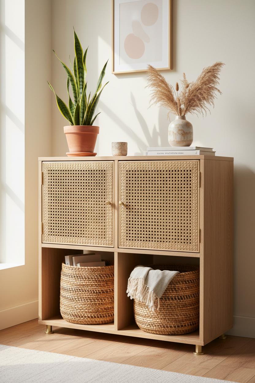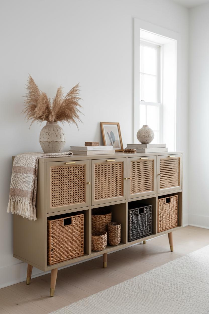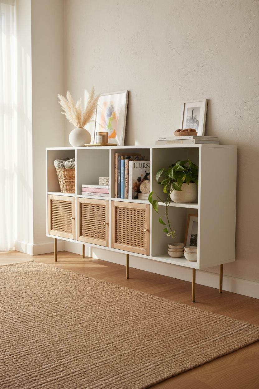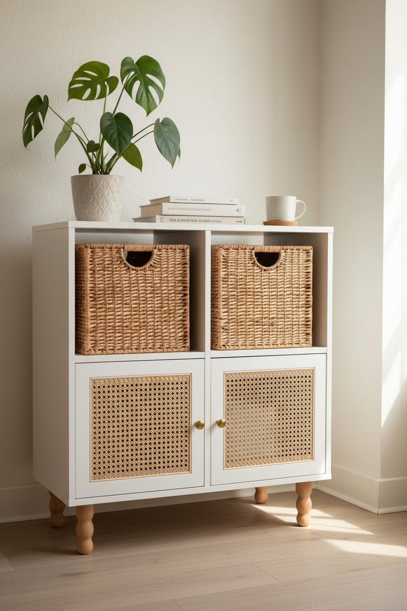 If you’re ready to take this Kallax hack beyond the basics, start by playing with paint. The laminate frame can absolutely look high-end with the right prep: a light scuff sand, an adhesion primer, and two coats of your favorite hue. I love a chalky clay or warm greige for that relaxed-boho vibe, or go bold with olive, slate blue, or even matte black for contrast against the light texture of cane webbing. You can also color-block—paint just the outer frame and leave the interior cubbies crisp white—or flip it and do a moody interior that makes your baskets glow. To shift the proportions, elevate the piece on furniture leg risers or slim tapered legs so it reads as a console instead of a cube shelf (bonus: it’s robot-vac friendly). For true renter friendly storage, keep major changes reversible: line shelves with peel and stick cane for a quick textural moment, or paint removable door inserts instead of the whole unit. These small upgrades are the kind of budget home decor tweaks that make IKEA hacks feel custom without the commitment.