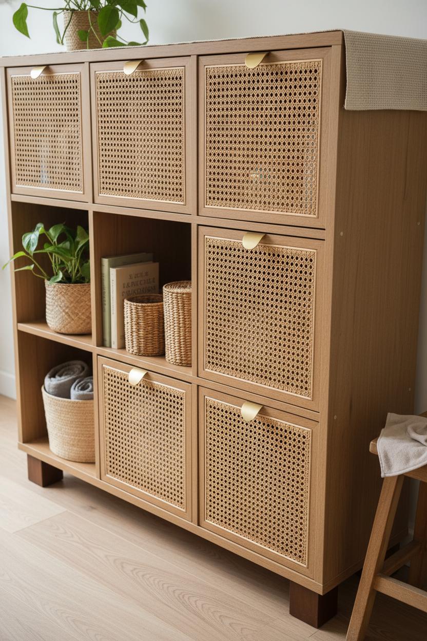 For renter friendly storage, think reversible layers. Instead of nailing or stapling, mount cane webbing to thin foam board or lightweight plywood cut to cube size, then secure the panels with removable Velcro strips or clear command hooks inside the cubbies—no holes, no heartache on move-out day. If you love the woven look but want zero tools, peel and stick cane sheets are a shortcut that reads custom without commitment; you can line door fronts, drawer inserts, or even the back panels to create a boutique-style backdrop for your treasures. Add rattan baskets that slide in and out like drawers to conceal cords and kid clutter while keeping the airy, boho vibe. For a touch of jewelry, swap in small brass cabinet pulls on door fronts or basket tags—instant polish that still feels handmade.
