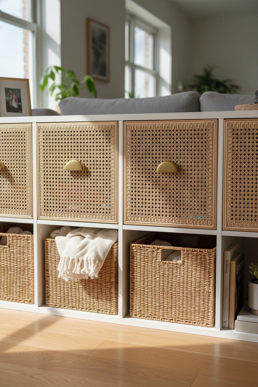 Now for the jewelry: brass cabinet pulls add that polished note that takes the Kallax from basic cube to boutique-built. Choose slender bar pulls or rounded arches—either will glow against the cane and make your budget home decor look custom. If you’re attaching to Kallax door inserts or a thin MDF face, pre-drill tiny pilot holes and use short machine screws with washers so you don’t punch through; for a no-drill approach, look for adhesive-backed hardware that still gives you the look without the commitment. To corral the daily bits and bobs, slide in rattan baskets sized for the 13-inch cubes—these bring warmth, hide the clutter, and echo the woven texture so the whole piece feels cohesive.
