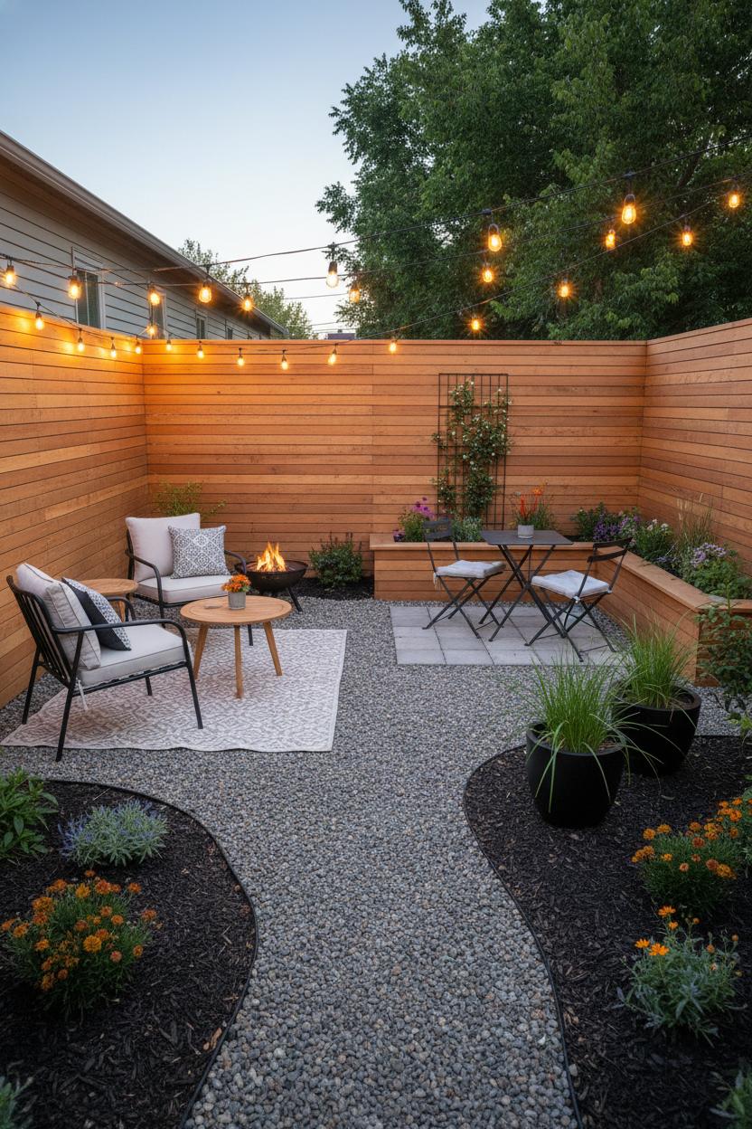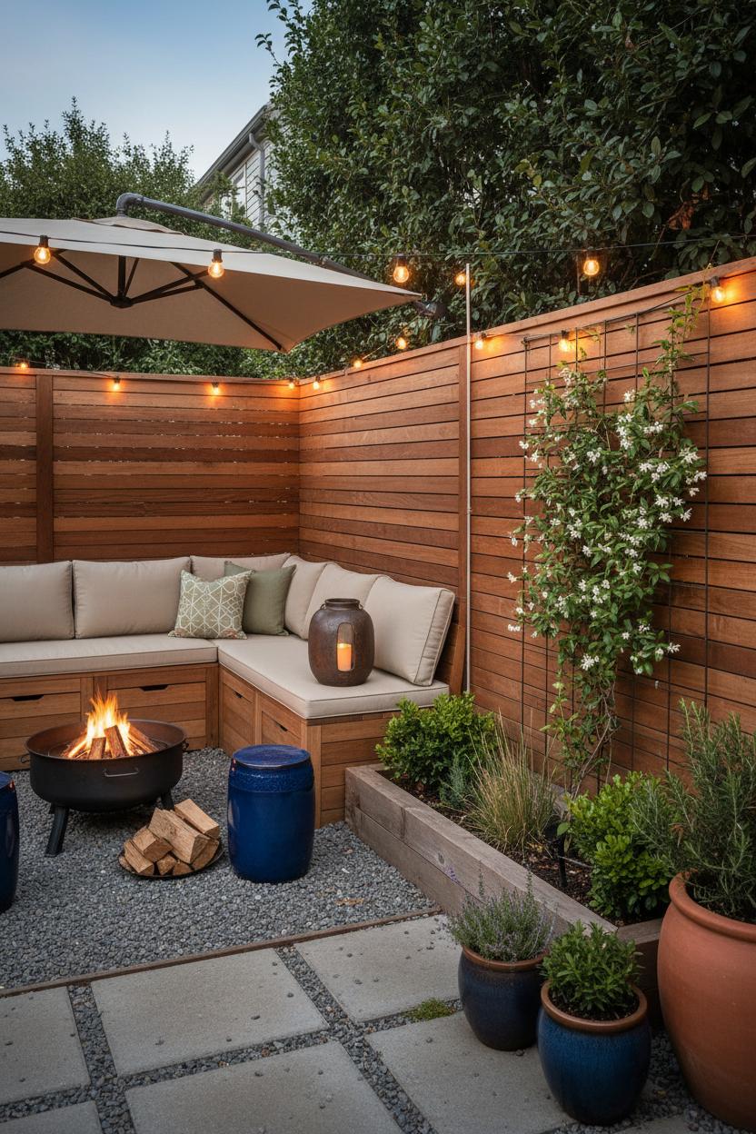 Privacy is all about layers, especially in a small yard design. Combine a slatted screen with a narrow trellis to blur sightlines, then soften the edges with tall planters or raised garden beds that double as a ledge for extra guests. Plant climbers from native plant seeds so they thrive with less water and care—think jasmine, clematis, or native honeysuckle, depending on your zone. For a low maintenance garden that still feels lush, mix evergreen shrubs in containers with drought-tolerant grasses and herbs; a drip line set on a timer keeps everything happy while you relax. If you love a fireside moment, a compact steel fire pit becomes a year-round focal point—set it on that gravel base for safety and a pulled-together look. Keep textiles simple and sunworthy (neutral cushions, one patterned throw), and let a single accent color—clay, sage, or inky blue—tie pots, stools, and planters together. These small, thoughtful yard ideas turn even a corner patio into a serene retreat. With a few smart backyard landscaping moves and a focus on multipurpose pieces, your nook stays tidy, welcoming, and wonderfully low-fuss—proof that the coziest corners often come in the smallest packages.