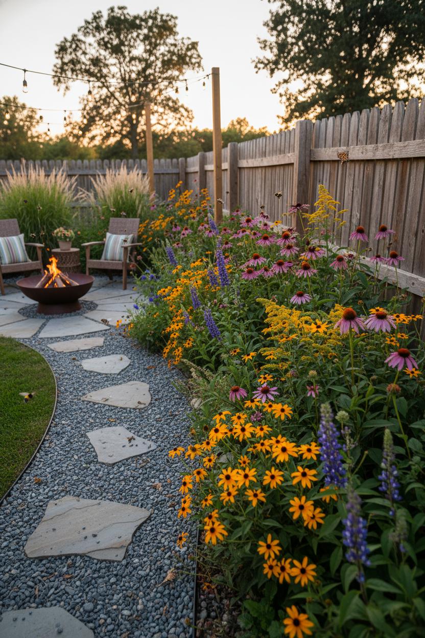 For cozy evenings, add a twinkle canopy of solar string lights over your path or seating area and park a steel fire pit nearby for crackling, stargazing nights—outdoor living at its dreamiest. Maintenance stays delightfully minimal: skip the constant deadheading, leave seed heads to feed birds, and wait until late winter or very early spring to give stems a quick cutback, which also protects overwintering beneficials. Toss a fresh handful of native plant seeds each fall to thicken the display, and pull the occasional weed while it’s tiny. That’s it. A few thoughtful gestures, a lot of payoff, and a soft, living edge to your space—proof that the best backyard landscaping and yard ideas don’t have to be complicated to feel extraordinary.
