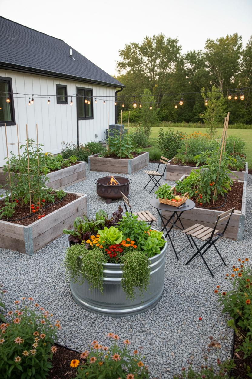 Design-wise, think cozy and connected to outdoor living. A cluster of raised garden beds flanking a bistro table or circling a steel fire pit turns harvest time into hangout time. Keep pathways wide enough for a wheelbarrow, mix tall crops with compact herbs for layered texture, and choose materials that echo your home’s trim for a pulled-together look. Even a single stock tank planter can be a showstopper filled with rainbow chard, marigolds, and trailing thyme. With good soil, smart watering, and a little sparkle from those lights, your beds stay neat, productive, and delightfully hands-off—just the way a busy, beautiful backyard should be.