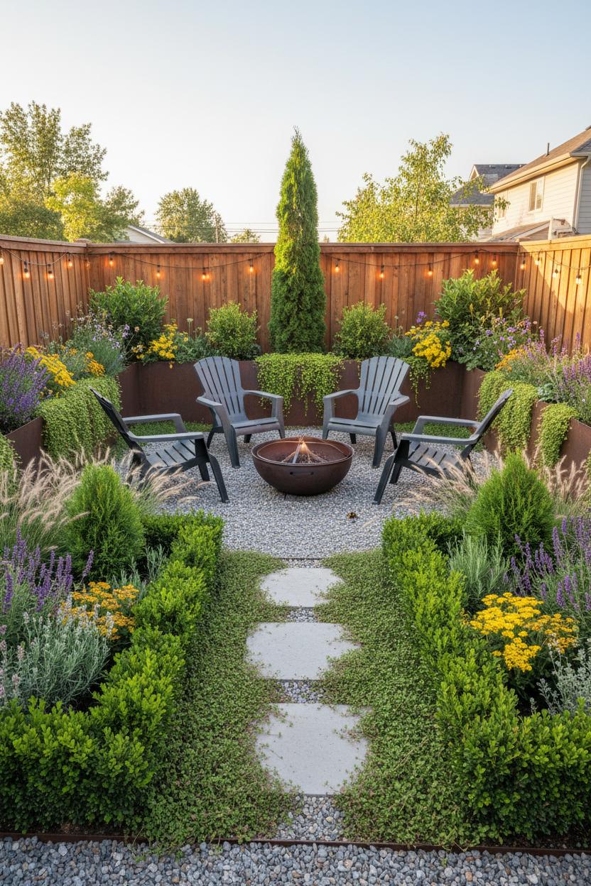 If you’re working on small yard design, layering is your secret superpower. Add instant height and order with raised garden beds along the perimeter; plant a tall evergreen or two toward the back, a mid-story of herbs and compact shrubs in the middle, then spillers—like trailing thyme or prostrate rosemary—up front so the edges look luxe and finished. Sprinkle in native plant seeds to fill gaps with climate-smart color and invite pollinators without upping the chore list. Create a welcoming focal point with a steel fire pit parked on a simple gravel patio, and drape solar string lights between fence posts for that golden-hour glow that flips every evening into outdoor living. Keep the palette tight and repeat plants in rhythmic clusters so the eye rests; three to five plant types, repeated, looks intentional and is easier to care for than a botanical free-for-all. The result is a layered, evergreen framework that thrives through heat and chill, asks for little more than occasional trims, and quietly turns your space—no matter the size—into a cozy, year-round oasis you can enjoy on autopilot.