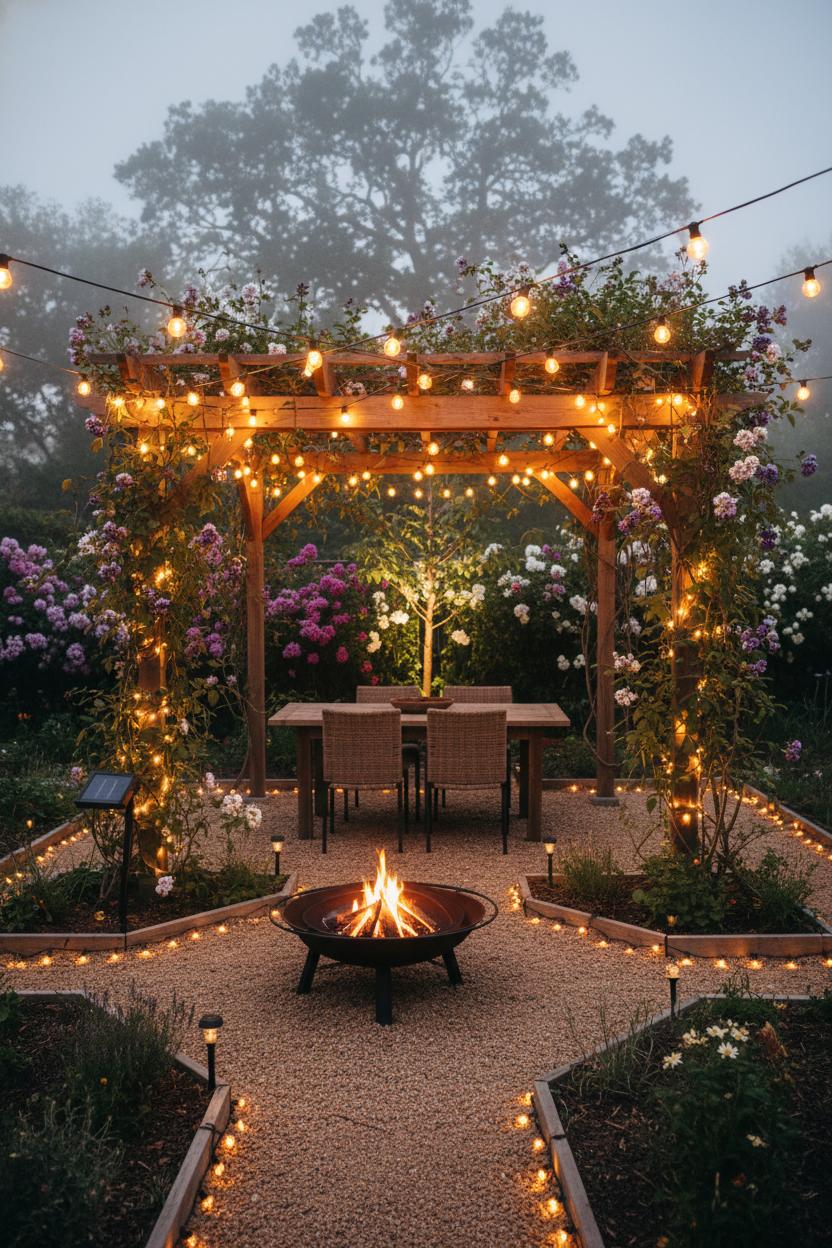 There’s nothing cozier than watching your yard exhale at dusk while the lights softly blink on all by themselves. Solar string lights are the ultimate set-it-and-forget-it upgrade—no cords, no outlets, no remembering to flip a switch—just that warm, welcoming glow that makes your space feel finished every single evening. Drape them from fence posts, zigzag them overhead to create a café-style canopy, or trace the edge of raised garden beds for subtle sparkle that doubles as a nighttime guide. If you’re working with a small yard design, run a few strands high to lift the eye and make the space feel taller, then tuck a shorter length along a path or over gravel landscaping to sketch out gentle movement through the garden. I love weaving them through a trellis or around a pergola beam, letting the bulbs peek through climbing vines or a patch of blooms grown from native plant seeds—instant magic that still reads effortless. It’s one of those yard ideas that instantly elevates your outdoor living, whether you’re sipping tea solo or hosting the neighbors.