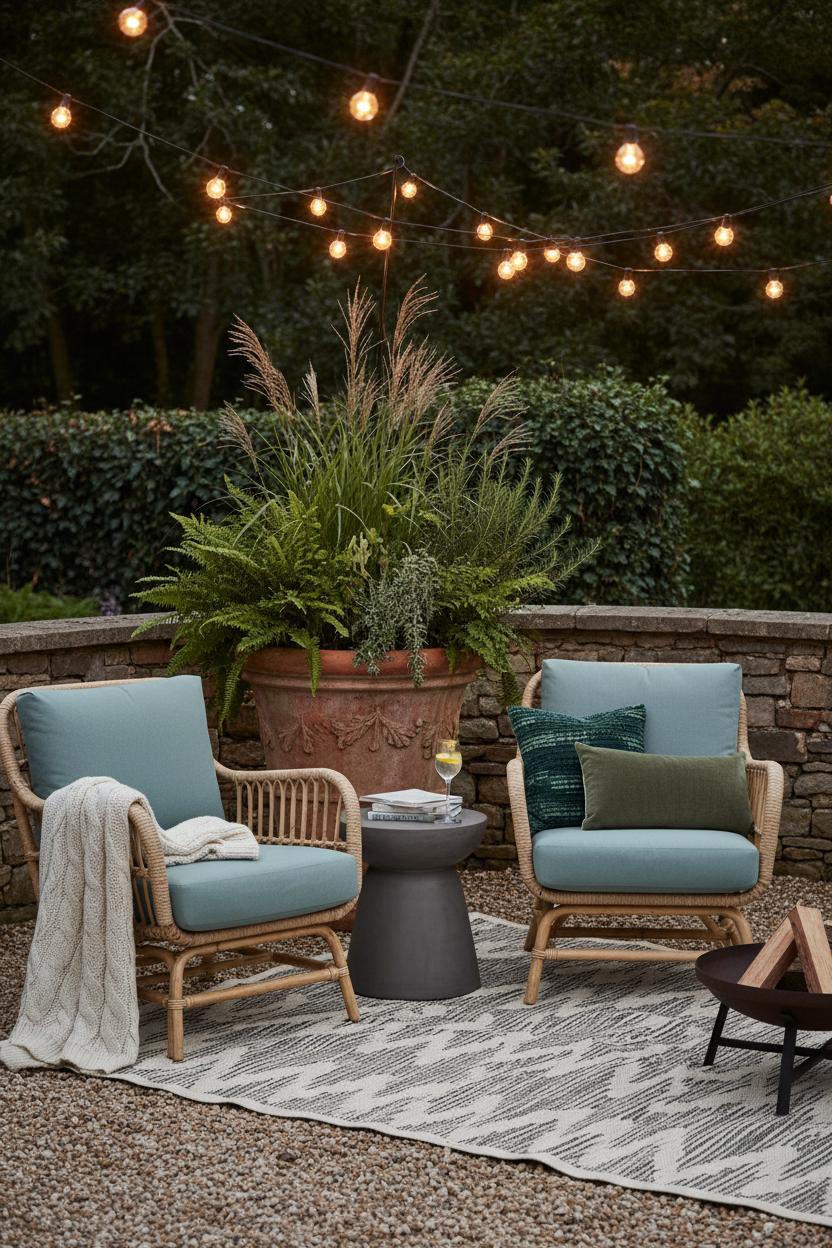 For a cozy focal point, a compact steel fire pit turns a quiet corner into an all-season gathering spot. Set it on a small gravel pad or a ring of pavers, pull up a couple of sturdy chairs, and stash a throw blanket nearby for instant hygge. Round things out with a painted front door-style pop on a thrifted bench, a few weathered terracotta pots grouped in threes, and a simple tray table for s’mores duty. None of this requires a contractor, just a free afternoon and the right materials. With these quick wins, your outdoor living setup goes from “someday” to “see you at sunset,” and you’ll spend more time enjoying than maintaining—it’s the ultimate cozy oasis, scaled perfectly to your weekend.